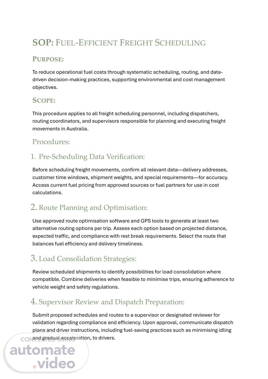 How-To Guide: Fuel-Efficient Freight Scheduling (Customised for Your SOP) Clear Actions for Improved Performance Understanding the Objectives • Minimise fuel consumption during freight operations. • Optimise scheduling and routing of freight deliveries. • Ensure full compliance with environmental regulations. Description Responsible Role Understanding the Objectives Operations Manager Familiarise Yourself with Key Terms • Fuel Efficiency: The measure of how effectively vehicles use fuel for freight transport. • Freight Scheduling: The process of planning when and how deliveries are made for best efficiency. Description Responsible Role Familiarise Yourself with Key Terms All Staff Implementation • Use approved planning tools to identify the most efficient delivery routes for each job. • Load trucks carefully and methodically, ensuring both safety and optimal use of vehicle capacity. • Schedule and document regular maintenance checks for every vehicle in the fleet to prevent breakdowns and maximise efficiency. Continuous Review • Track and assess fuel consumption trends for all vehicles. Look for patterns and areas for improvement..