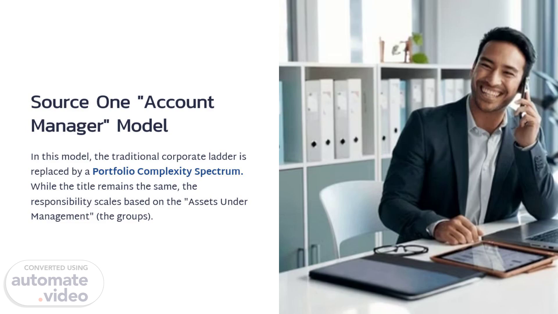 [Audio] Source One "Account Manager" Model In this model, the traditional corporate ladder is replaced by a Portfolio Complexity Spectrum. While the title remains the same, the responsibility scales based on the "Assets Under Management" (the groups)..