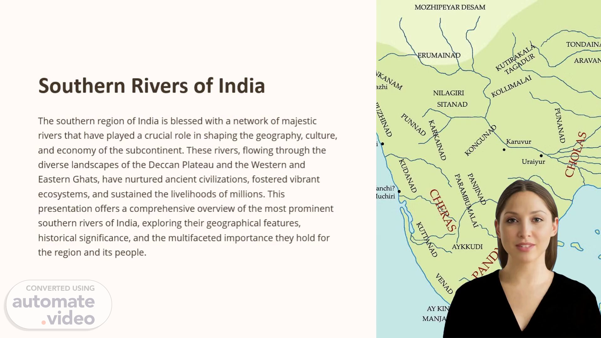 [Virtual Presenter] The rivers of the southern region of India have been integral to the deep history of the region. They have nurtured life sustained livelihoods and fostered vibrant ecosystems along their courses. This presentation will explore the prominent rivers of India from the Deccan Plateau to the Western and Eastern Ghats. We will look at their geographic features historical significance and the multifaceted importance they hold for the cultures and people of southern India. From the mighty Kaveri to the Sabarmati these rivers have long been sources of life and culture..
