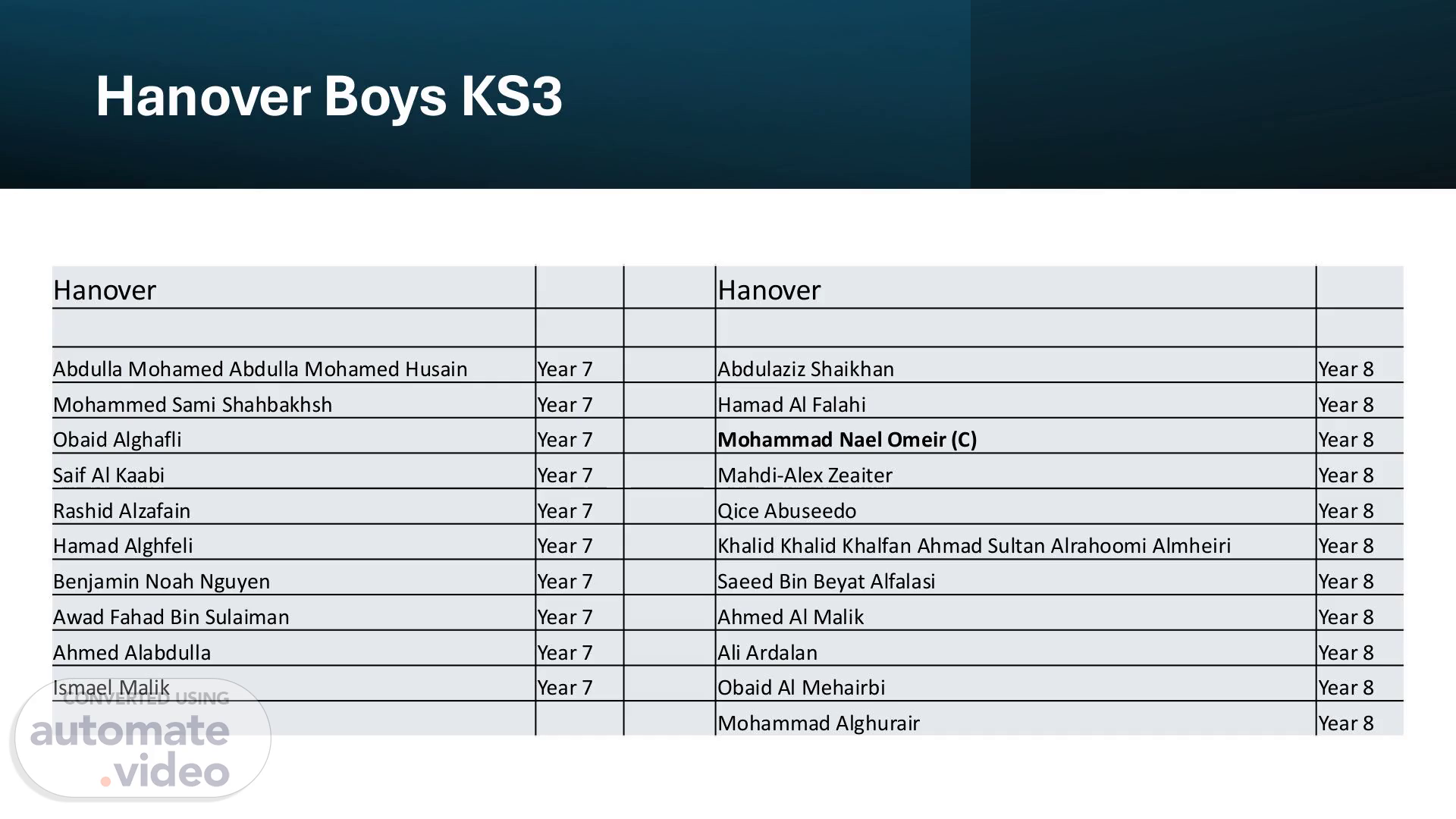 Hanover Boys KS3 Hanover Hanover Abdulla Mohamed Abdulla Mohamed Husain Year 7 Abdulaziz Shaikhan Year 8 Mohammed Sami Shahbakhsh Year 7 Hamad Al Falahi Year 8 Obaid Alghafli Year 7 Mohammad Nael Omeir (C) Year 8 Saif Al Kaabi Year 7 Mahdi-Alex Zeaiter Year 8 Rashid Alzafain Year 7 Qice Abuseedo Year 8 Hamad Alghfeli Year 7 Khalid Khalid Khalfan Ahmad Sultan Alrahoomi Almheiri Year 8 Benjamin Noah Nguyen Year 7 Saeed Bin Beyat Alfalasi Year 8 Awad Fahad Bin Sulaiman Year 7 Ahmed Al Malik Year 8 Ahmed Alabdulla Year 7 Ali Ardalan Year 8 Ismael Malik Year 7 Obaid Al Mehairbi Year 8 Mohammad Alghurair Year 8.