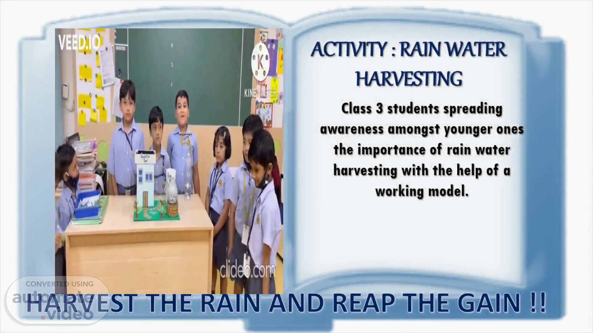 Class 3 students spreading awareness amongst younger ones the importance of rain water harvesting with the help of a working model..
