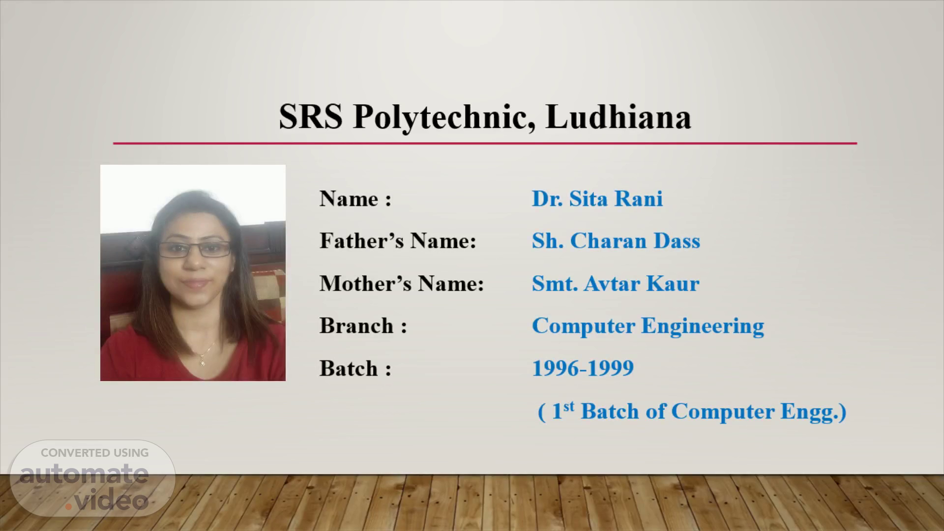 SRS Polytechnic, Ludhiana. Name : Dr. Sita Rani Father’s Name: Sh. Charan Dass Mother’s Name: Smt. Avtar Kaur Branch : Computer Engineering Batch : 1996-1999 ( 1 st Batch of Computer Engg .).