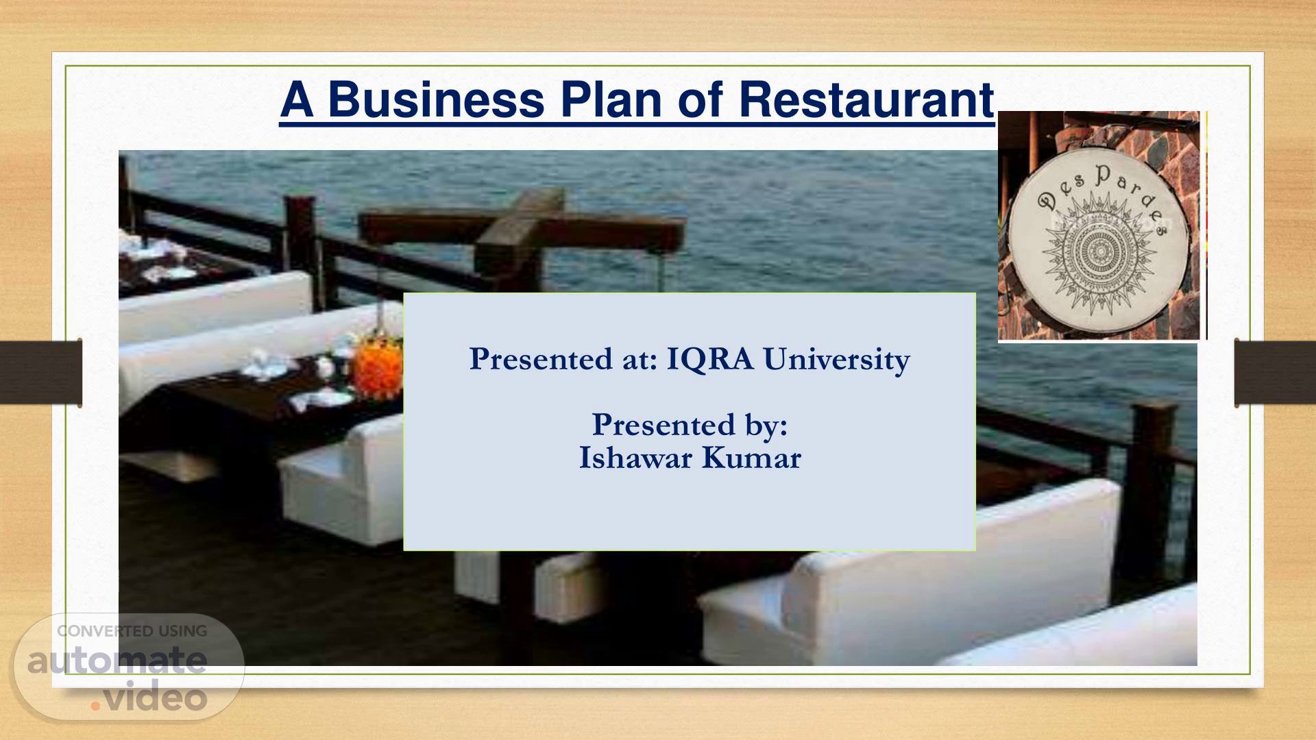 A Business Plan of Restaurant Presented at: IQRA University Presented by: Ishawar Kumar.
