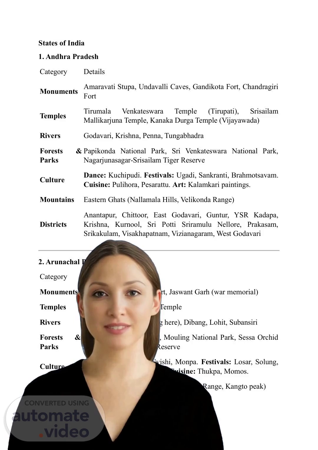 [Virtual Presenter] The state of Andhra Pradesh is situated in the southeastern part of India and is the eighth largest state in the country. It is known for its diverse landscapes, including its famous rivers, forests, and mountains. The state is home to many ancient monuments, including the Amaravati Stupa, Undavalli Caves, and Gandikota Fort, which showcase the rich history and architectural beauty of the region. The famous Tirumala Venkateswara Temple, also known as the Tirupati Balaji Temple, is a significant religious landmark for Hindus. Andhra Pradesh is also known for its beautiful temples, such as the Srisailam Mallikarjuna Temple and Kanaka Durga Temple, both of which attract a large number of pilgrims every year. The state is blessed with many rivers, including the Godavari, Krishna, Penna, and Tungabhadra, all of which play a crucial role in the agriculture and economy of the state. Andhra Pradesh is famous for its lush green forests and national parks, such as the Papikonda National Park, Sri Venkateswara National Park, and the Nagarjunasagar-Srisailam Tiger Reserve. These protected areas are home to a diverse range of flora and fauna, making it a popular destination for nature lovers and adventure seekers. The culture of Andhra Pradesh is a vibrant mix of traditions, festivals, and cuisines. Some of the well-known festivals celebrated here include Ugadi, Sankranti, and the grand Brahmotsavam festival. The state also boasts a unique classical dance form, Kuchipudi, and is known for its delicious cuisine, including dishes like Pulihora and Pesarattu. Andhra Pradesh is home to the Eastern Ghats, with the Nallamala Hills and Velikonda Range being popular among trekkers and nature enthusiasts. The state is divided into thirteen districts, each with its own distinct culture and history..