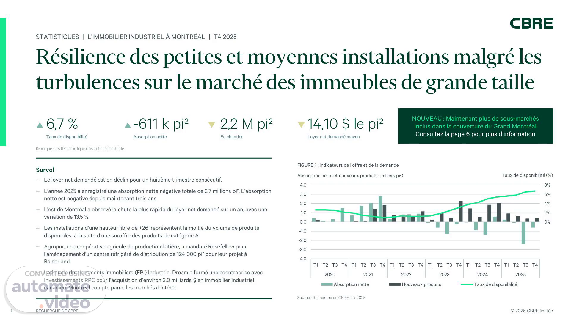 2 RECHERCHE DE CBRE © 2026 CBRE limitée STATISTIQUES | L’IMMOBILIER INDUSTRIEL À MONTRÉAL | T4 2025 Les produits de qualité dominent le paysage Après un déclin de l’absorption nette dans le Grand Montréal au T4 à -611 000 pi², 2025 se conclue avec une absorption nette négative totale de 2,7 millions pi² – soit une troisième année de données négatives. C’est la baisse cumulative de l’espace occupé la plus importante depuis 2009, où l’absorption nette négative avait touché 3,6 millions pi². Le marché avait ensuite rapidement rebondi avec cinq ans d’absorption positive. L’est de Montréal a dominé la disponibilité avec une absorption nette négative de 1,8 million pi². 48,6 % de cette absorption a eu lieu au T4, l’arrondissement Anjou ajoutant à lui seul 410 000 pi² sur le marché. Ces disponibilités incluaient une vaste propriété de 137 000 pi², le reste se composant d’installations de taille moyenne. Les produits d’une hauteur libre de +26’ accaparent la moitié du marché locatif, notamment en raison d’une suroffre d’installations de catégorie A. Au T4 2021, elles représentaient 11,9 % de la disponibilité. Les promoteurs avaient donc accéléré leurs projets afin de répondre à la demande et, depuis le T3 2024, les immeubles d’une hauteur libre de +26’ forment au moins 44,6 % de la disponibilité. La stabilisation anticipée des tarifs en 2026 pourrait débloquer la demande insatisfaite des sociétés multinationales qui devraient prioriser ce segment de marché. FIGURE 2 : Volume de produits disponibles selon la hauteur libre (millions pi²) Source : Recherche de CBRE, T4 2025. FIGURE 4 : Volume de produits disponibles selon la fourchette de superficie (millions pi²) Source : Recherche de CBRE, T4 2025. 0.0 2.0 4.0 6.0 8.0 10.0 12.0 T1 T2 T3 T4 T1 T2 T3 T4 T1 T2 T3 T4 T1 T2 T3 T4 T1 T2 T3 T4 2021 2022 2023 2024 2025 0-5 pi² 5 k - 10 k pi² 10 k - 25 k pi² 25 k - 75 k pi² 75 k - 150 k pi² +150 k pi² -6.0 -4.0 -2.0 0.0 2.0 4.0 6.0 8.0 10.0 2005 2006 2007 2008 2009 2010 2011 2012 2013 2014 2015 2016 2017 2018 2019 2020 2021 2022 2023 2024 2025 FIGURE 3 : Variation de l’absorption nette au cours des vingt dernières années (millions pi²) Source : Recherche de CBRE, T4 2025. 0.0 5.0 10.0 15.0 20.0 25.0 30.0 T1 T2 T3 T4 T1 T2 T3 T4 T1 T2 T3 T4 T1 T2 T3 T4 T1 T2 T3 T4 T1 T2 T3 T4 T1 T2 T3 T4 2019 2020 2021 2022 2023 2024 2025 > 26' 18' - 26' < 18'.