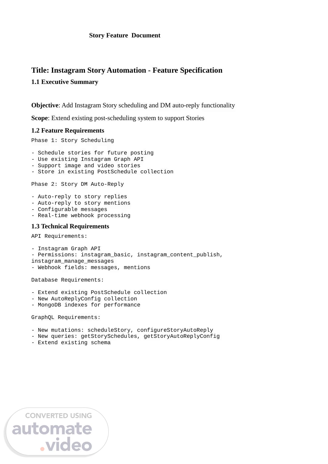 [Audio] Story Feature Document Title: Instagram Story Automation - Feature Specification 1.1 Executive Summary Objective: Add Instagram Story scheduling and DM auto-reply functionality Scope: Extend existing post-scheduling system to support Stories 1.2 Feature Requirements Phase 1: Story Scheduling - Schedule stories for future posting - Use existing Instagram Graph API - Support image and video stories - Store in existing PostSchedule collection Phase 2: Story DM Auto-Reply - Auto-reply to story replies - Auto-reply to story mentions - Configurable messages - Real-time webhook processing 1.3 Technical Requirements API Requirements: - Instagram Graph API - Permissions: instagram_basic, instagram_content_publish, instagram_manage_messages - Webhook fields: messages, mentions Database Requirements: - Extend existing PostSchedule collection - New AutoReplyConfig collection - MongoDB indexes for performance GraphQL Requirements: - New mutations: scheduleStory, configureStoryAutoReply - New queries: getStorySchedules, getStoryAutoReplyConfig - Extend existing schema.