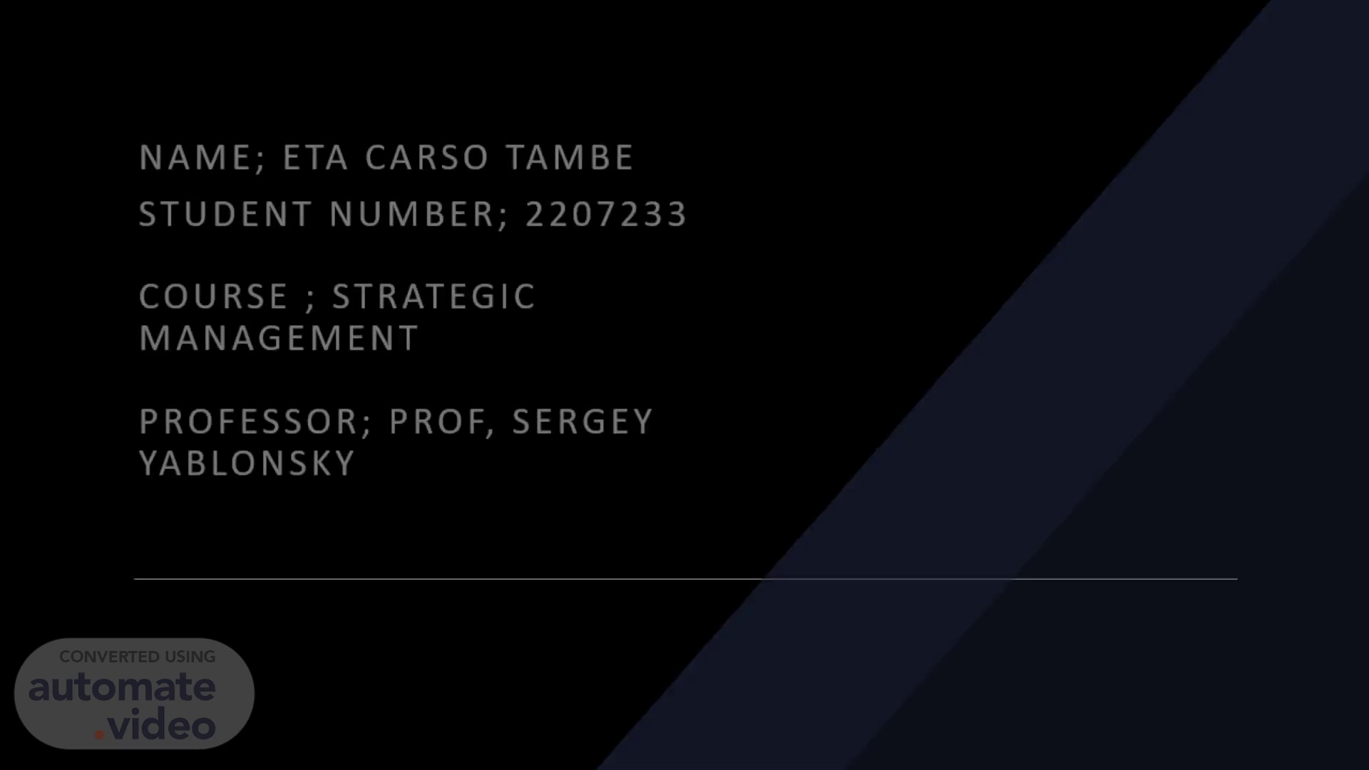 NAME; ETA CARSO TAMBE STUDENT NUMBER; 2207233 Course ; Strategic management professor; prof, sergey yablonsky.