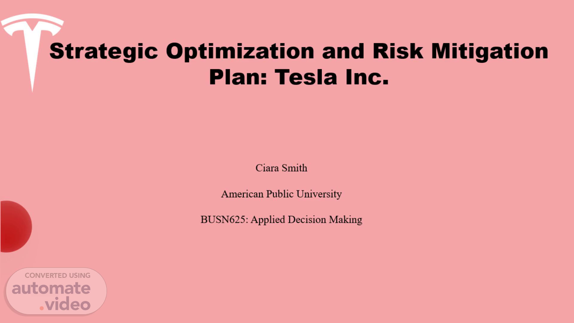 [Audio] Strategic Optimization and Risk Mitigation Plan: Tesla Inc. Ciara Smith American Public University BUSN625: Applied Decision Making Hello, My name is Ciara Smith. Welcome to this strategic optimization and risk mitigation plan regarding Tesla's upcoming entry into the Indian market. India's electric vehicle marketplace is a high-stakes environment with immense growth potential, projected to reach 10 million annual units by 2030. As an organization, Tesla is defined by its unique mission to accelerate the world's transition to sustainable energy. To achieve this in new territories, we must move beyond traditional automotive manufacturing thinking and apply IT-based concepts to navigate regulatory complexity and market volatility. This presentation will demonstrate how the integration of strategic risk analysis provides the visibility needed to make proactive, evidence-based decisions. Our objective is to ensure that Tesla's expansion into India builds a solid foundation for sustainable development and protects the company's organizational value.