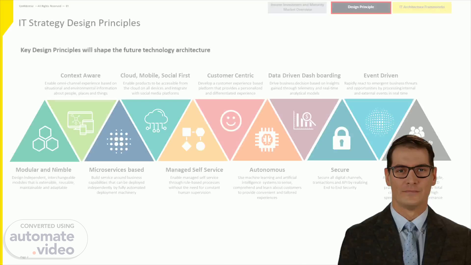 [Audio] Technology architecture for the future is strongly influenced by foundational design principles and IT frameworks. A market review highlights insurers' investments in and progress of their technology projects. Our composite business services leverage API-driven approach to expose services and create an encompassing, interactive digital experience, easily accessible from various devices. We make sure customers receive personalized experiences through tailored customer journeys. On the technical side, cloud-based infrastructure enables self-service options, and business process management and rules link up indifferently to policy administration systems, bringing the optimality of a digital platform layer..