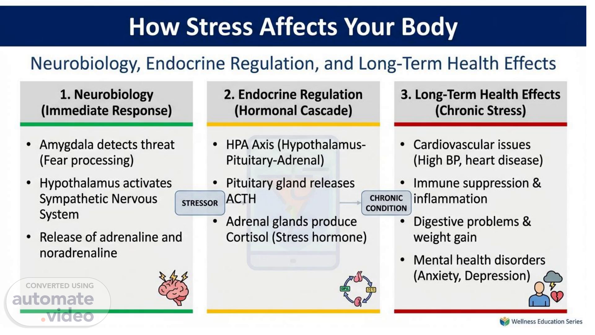 How Stress Affects Your Body Neurobiology, Endocrine Regulation, and Long-Term Health Effects 1. Neurobiology 2. Endocrine Regulation (Immediate Response) (Hormonal Cascade) • Amygdala detects threat • HPA Axis (Hypothalamus- (Fear processing) Pituitary-Adrenal) • Hypothalamus activates • Pituitary gland releases Sympathetic Nervous STRESSOR System • Release of adrenaline and noradrenaline ACTH CHRONIC CONDITION • Adrenal glands produce Cortisol (Stress hormone) 3. Long-Term Health Effects (Chronic Stress) Cardiovascular issues (High BP, heart disease) Immune suppression & inflammation • Digestive problems & weight gain • Mental health disorders (Anxiety, Depression) Wellness Education Series.