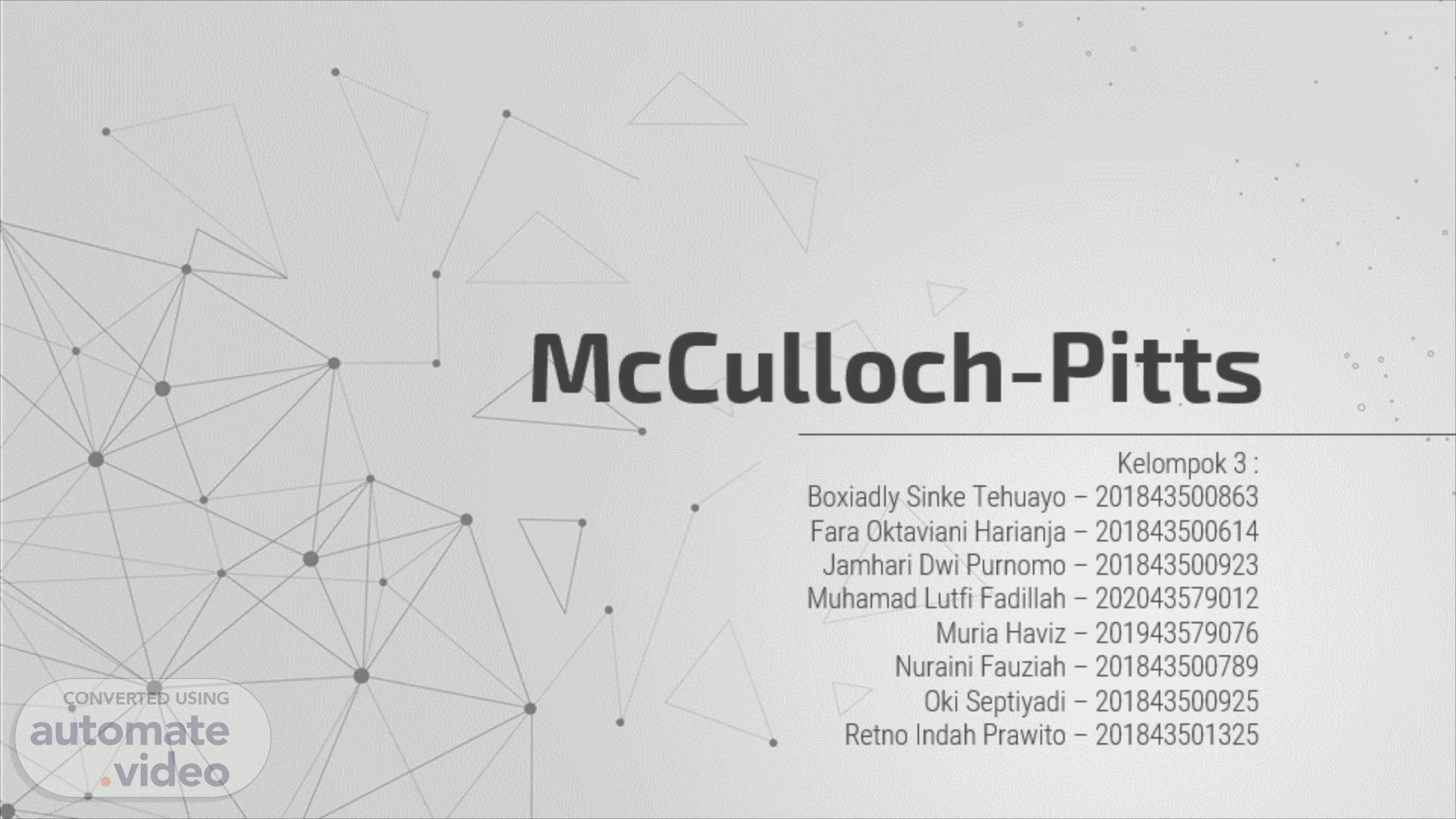 M cCulloch-Pitts. Kelompok 3 : Boxiadly Sinke Tehuayo – 201843500863 Fara Oktaviani Harianja – 201843500614 Jamhari Dwi Purnomo – 201843500923 Muhamad Lutfi Fadillah – 202043579012 Muria Haviz – 201943579076 Nuraini Fauziah – 201843500789 Oki Septiyadi – 201843500925 Retno Indah Prawito – 201843501325.