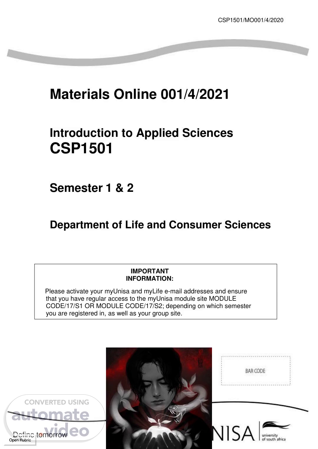 [Audio] CSP1501/MO001/4/2020 Materials Online 001/4/2021 Introduction to Applied Sciences CSP1501 Semester 1 & 2 Department of Life and Consumer Sciences IMPORTANT INFORMATION: Please activate your myUnisa and myLife e-mail addresses and ensure that you have regular access to the myUnisa module site MODULE CODE/17/S1 OR MODULE CODE/17/S2; depending on which semester you are registered in, as well as your group site. 1 Define tomorrow Open Rubric Open Rubric.