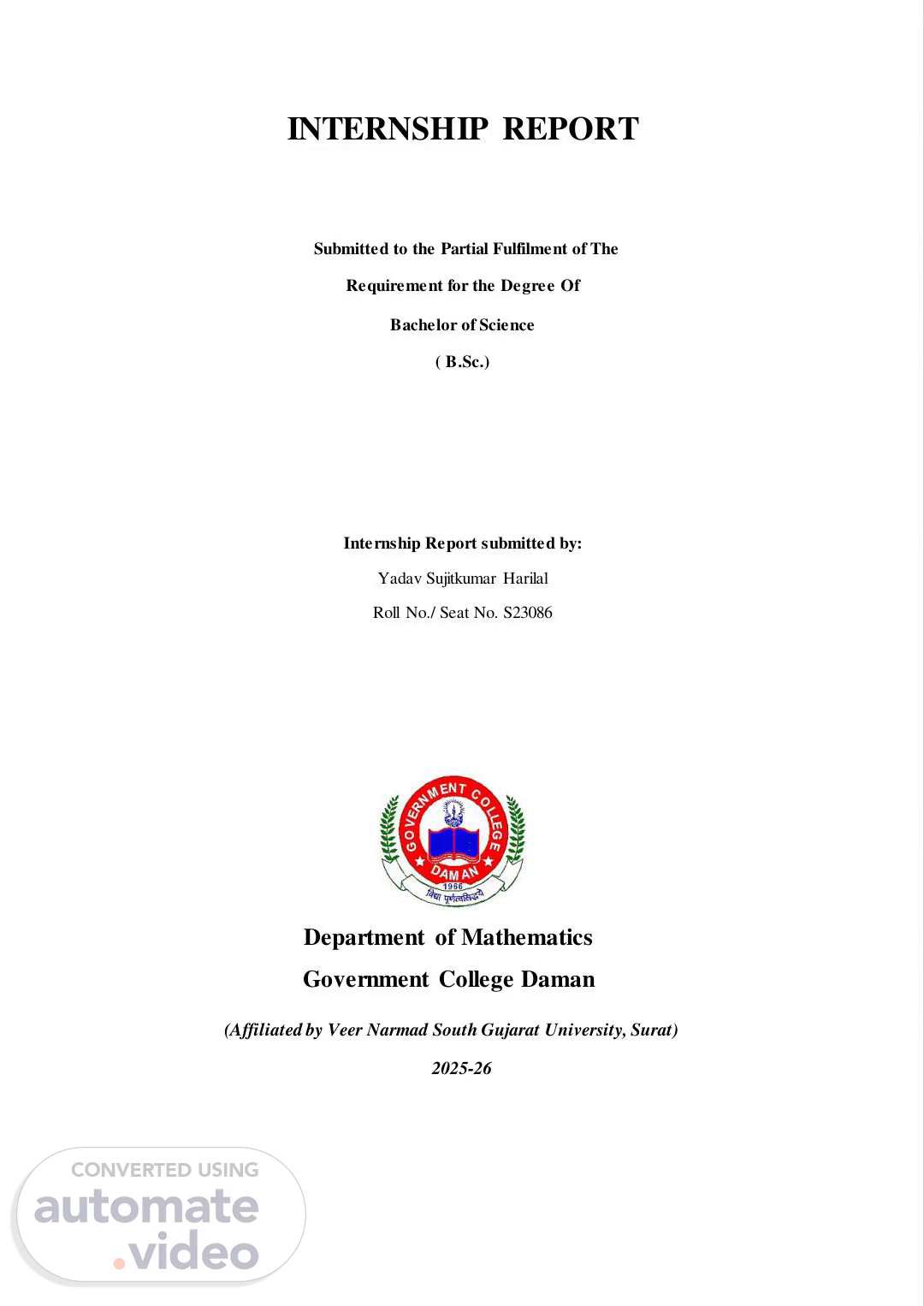 INTERNSHIP REPORT Submitted to the Partial Fulfilment of The Requirement for the Degree Of Bachelor of Science ( B.Sc.) Internship Report submitted by: Yadav Sujitkumar Harilal Roll No./ Seat No. S23086 Department of Mathematics Government College Daman (Affiliated by Veer Narmad South Gujarat University, Surat) 2025-26.