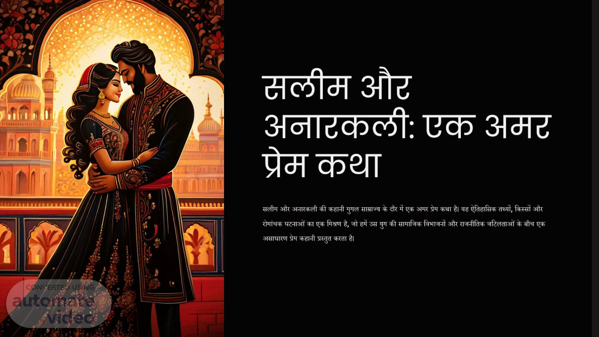 [Audio] सलीम और अनारकली: एक अमर प्रेम कथा सलीम और अनारकली की कहानी मुगल साम्राज्य के दौर में एक अमर प्रेम कथा है। यह ऐतिहासिक तथ्यों, किस्सों और रोमांचक घटनाओं का एक मिश्रण है, जो हमें उस युग की सामाजिक विभाजनों और राजनीतिक जटिलताओं के बीच एक असाधारण प्रेम कहानी प्रस्तुत करता है।.