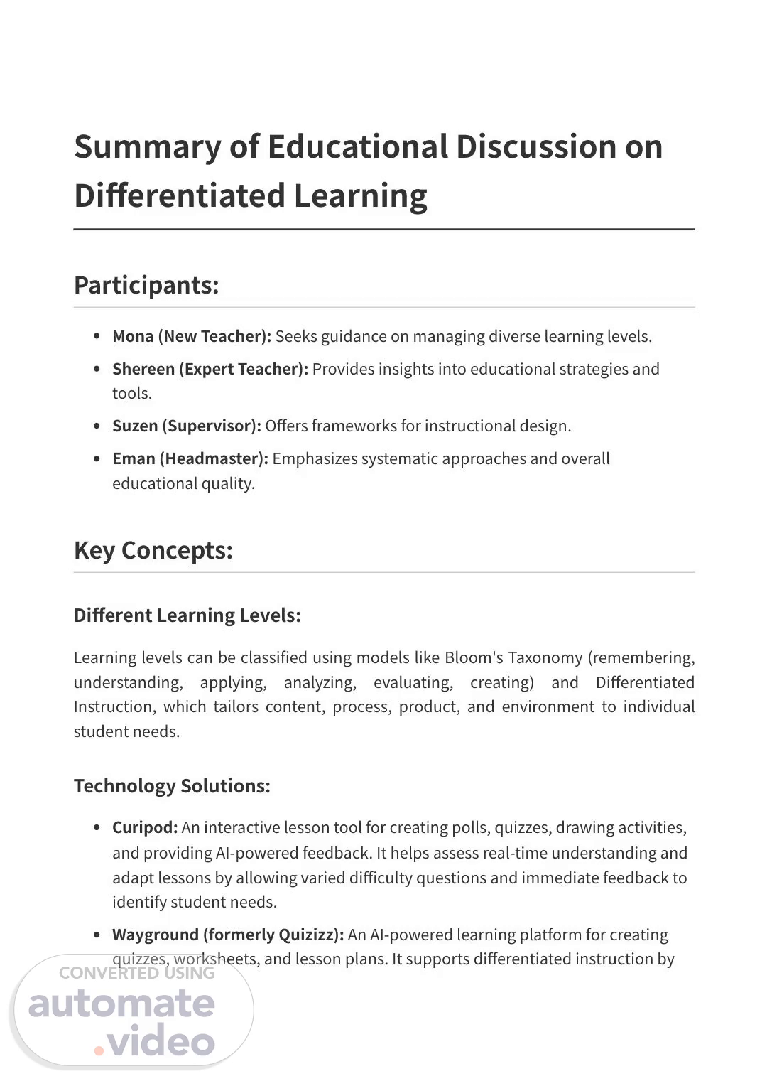 Summary of Educational Discussion on Differentiated Learning Participants: Mona (New Teacher): Seeks guidance on managing diverse learning levels. Shereen (Expert Teacher): Provides insights into educational strategies and tools. Suzen (Supervisor): Offers frameworks for instructional design. Eman (Headmaster): Emphasizes systematic approaches and overall educational quality. Key Concepts: Different Learning Levels: Learning levels can be classified using models like Bloom's Taxonomy (remembering, understanding, applying, analyzing, evaluating, creating) and Differentiated Instruction, which tailors content, process, product, and environment to individual student needs. Technology Solutions: Curipod: An interactive lesson tool for creating polls, quizzes, drawing activities, and providing AI-powered feedback. It helps assess real-time understanding and adapt lessons by allowing varied difficulty questions and immediate feedback to identify student needs. Wayground (formerly Quizizz): An AI-powered learning platform for creating quizzes, worksheets, and lesson plans. It supports differentiated instruction by.