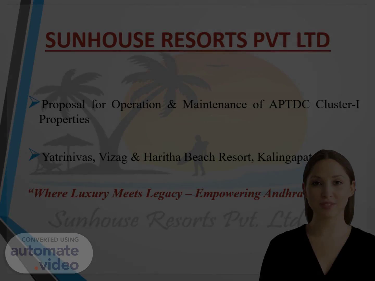 [Audio] In this slide, we will discuss our proposal to manage and maintain APTDC Cluster-I properties, specifically Yatrinivas in Vizag and Haritha Beach Resort in Kalingapatnam under the brand of Sunhouse Resorts. Our goal is to merge luxury and legacy to boost Andhra tourism. Sunhouse Resorts Pvt. Ltd., a flagship of BIG B Group, is a recognized leader in the Indian hospitality sector. With our proven expertise in luxury resorts, leisure tourism, casinos, wellness retreats, and eco-tourism, our group has set the benchmark for world-class tourism in Goa. We have expertise, investment capability, and global partnerships to bring this same success to Andhra Pradesh. Our proposal aligns with APTDC's vision to enhance state tourism through PPP-based development. We aim to not only manage the properties, but also upgrade them into international-standard tourism hubs, ensuring sustainable growth and community benefit. This partnership with APTDC will also generate higher revenues for the state. Please continue to the next slide for more details..