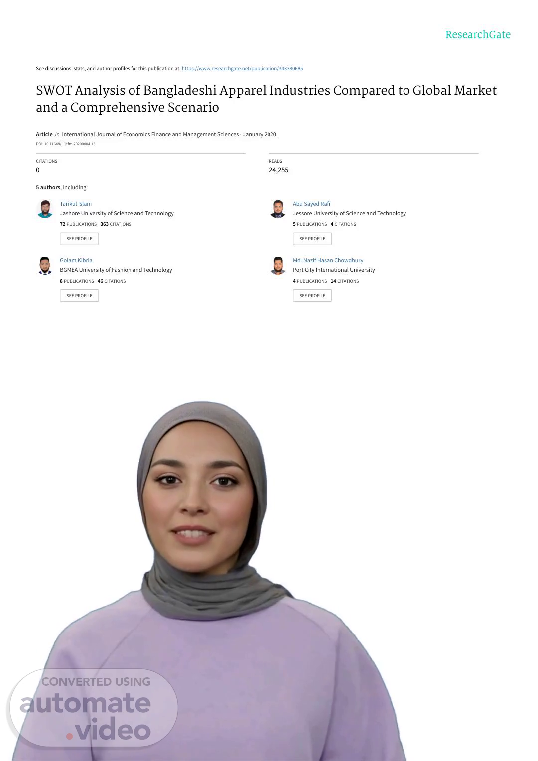 [Virtual Presenter] In this publication Tarikul Islam Abu Sayed Rafi Golam Kibria and Md. Nazif Hasan Chowdhury explore the strengths weaknesses opportunities and threats of the Bangladeshi Apparel Industries in the context of the global market. By analyzing the data and trends of the industry they present a comprehensive scenario of its current and future situations. This work is an important contribution to the industry that demonstrates the potential of Bangladeshi Apparel Industries and provides useful insights for future investments..