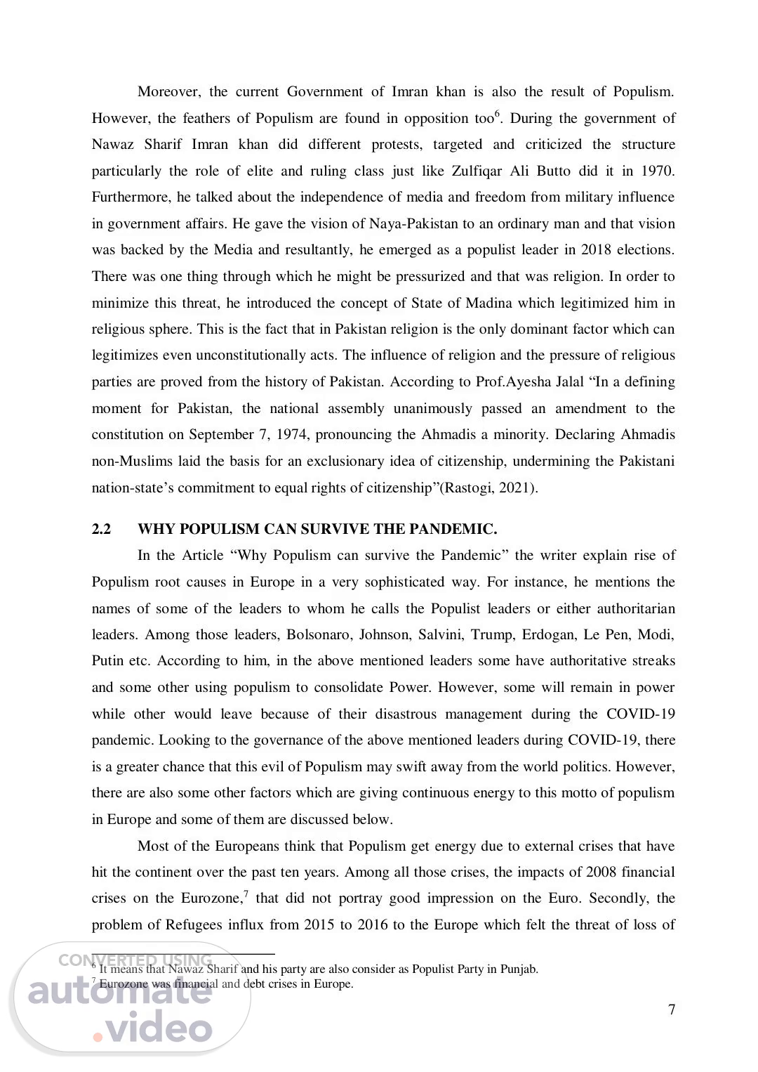7 Moreover, the current Government of Imran khan is also the result of Populism. However, the feathers of Populism are found in opposition too6. During the government of Nawaz Sharif Imran khan did different protests, targeted and criticized the structure particularly the role of elite and ruling class just like Zulfiqar Ali Butto did it in 1970. Furthermore, he talked about the independence of media and freedom from military influence in government affairs. He gave the vision of Naya-Pakistan to an ordinary man and that vision was backed by the Media and resultantly, he emerged as a populist leader in 2018 elections. There was one thing through which he might be pressurized and that was religion. In order to minimize this threat, he introduced the concept of State of Madina which legitimized him in religious sphere. This is the fact that in Pakistan religion is the only dominant factor which can legitimizes even unconstitutionally acts. The influence of religion and the pressure of religious parties are proved from the history of Pakistan. According to Prof.Ayesha Jalal “In a defining moment for Pakistan, the national assembly unanimously passed an amendment to the constitution on September 7, 1974, pronouncing the Ahmadis a minority. Declaring Ahmadis non-Muslims laid the basis for an exclusionary idea of citizenship, undermining the Pakistani nation-state’s commitment to equal rights of citizenship”(Rastogi, 2021). 2.2 WHY POPULISM CAN SURVIVE THE PANDEMIC. In the Article “Why Populism can survive the Pandemic” the writer explain rise of Populism root causes in Europe in a very sophisticated way. For instance, he mentions the names of some of the leaders to whom he calls the Populist leaders or either authoritarian leaders. Among those leaders, Bolsonaro, Johnson, Salvini, Trump, Erdogan, Le Pen, Modi, Putin etc. According to him, in the above mentioned leaders some have authoritative streaks and some other using populism to consolidate Power. However, some will remain in power while other would leave because of their disastrous management during the COVID-19 pandemic. Looking to the governance of the above mentioned leaders during COVID-19, there is a greater chance that this evil of Populism may swift away from the world politics. However, there are also some other factors which are giving continuous energy to this motto of populism in Europe and some of them are discussed below. Most of the Europeans think that Populism get energy due to external crises that have hit the continent over the past ten years. Among all those crises, the impacts of 2008 financial crises on the Eurozone,7 that did not portray good impression on the Euro. Secondly, the problem of Refugees influx from 2015 to 2016 to the Europe which felt the threat of loss of 6 It means that Nawaz Sharif and his party are also consider as Populist Party in Punjab. 7 Eurozone was financial and debt crises in Europe..