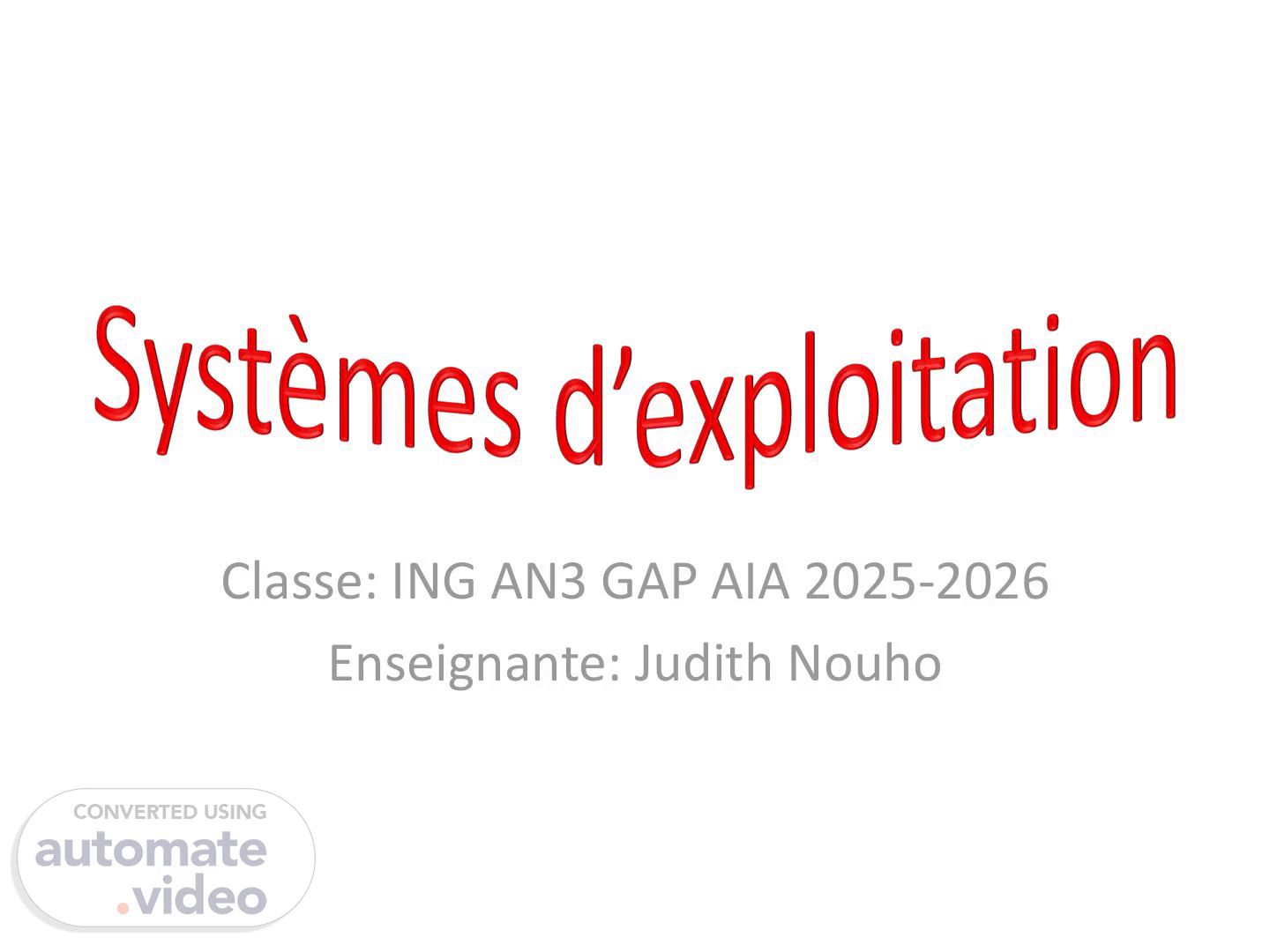 [Audio] Objectifs du cours Ce cours vise à familiariser l'étudiant avec les concepts et les techniques fondamentales des systèmes d'exploitation. Il porte, notamment, sur l'étude des : différents modules du noyau du système d'exploitation (gestionnaires de processus, de fichiers, de la mémoire, de processeurs, des E/S…), interactions entre ces modules, problèmes liés à leurs implémentations, ainsi que les différentes solutions adoptées dans les systèmes modernes (UNIX, Linux, Windows). Au terme de ce cours, l'étudiant sera en mesure de : expliquer et analyser les différents modules du système d'exploitation (leurs fonctionnements et mises en œuvre), utiliser et/ou adapter les techniques et les services du système d'exploitation pour concevoir des codes plus fiables et plus performants 2.
