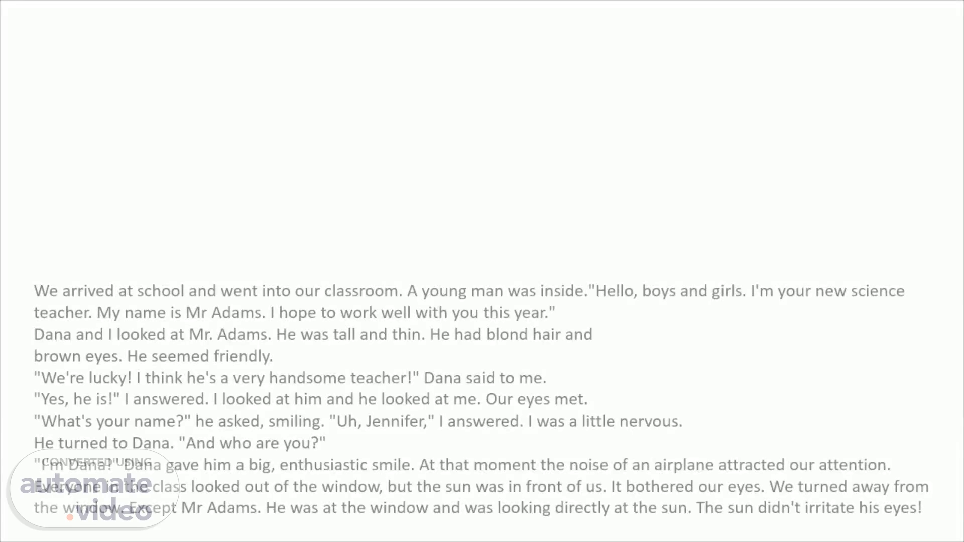 [Audio] My name is Jennifer Dale. My friends call me Jenny. I'm 16 years old and I live near Boston. My town is beautiful and very green. I live here with my parents and my dog, Fred. I go to school at Jefferson High and I want to become a journalist. In my free time I play volleyball and I listen to "heavy metal" music. I want to tell you my story. It was the first day of high school. I was excited. I already knew most of my classmates, but I didn't know my new teachers. I got up, ate my breakfast and went to school. On the street I met my friend, Dana; her house is near mine and we always walk to school together. "I hope our new teachers are men. And I hope they're handsome!" Dana said. Dana loves talking about boys. 'Yes, I need something new and interesting in my life," I answered. We arrived at school and went into our classroom. A young man was inside. "Hello, boys and girls. I'm your new science teacher. My name is Mr Adams. I hope to work well with you this year." Dana and I looked at Mr. Adams. He was tall and thin. He had blond hair and brown eyes. He seemed friendly. "We're lucky! I think he's a very handsome teacher!" Dana said to me. "Yes, he is!" I answered. I looked at him and he looked at me. Our eyes met. "What's your name?" he asked, smiling. "Uh, Jennifer," I answered. I was a little nervous. He turned to Dana. "And who are you?" "I'm Dana!" Dana gave him a big, enthusiastic smile. At that moment the noise of an airplane attracted our attention. Everyone in the class looked out of the window, but the sun was in front of us. It bothered our eyes. We turned away from the window. Except Mr Adams. He was at the window and was looking directly at the sun. The sun didn't irritate his eyes!.