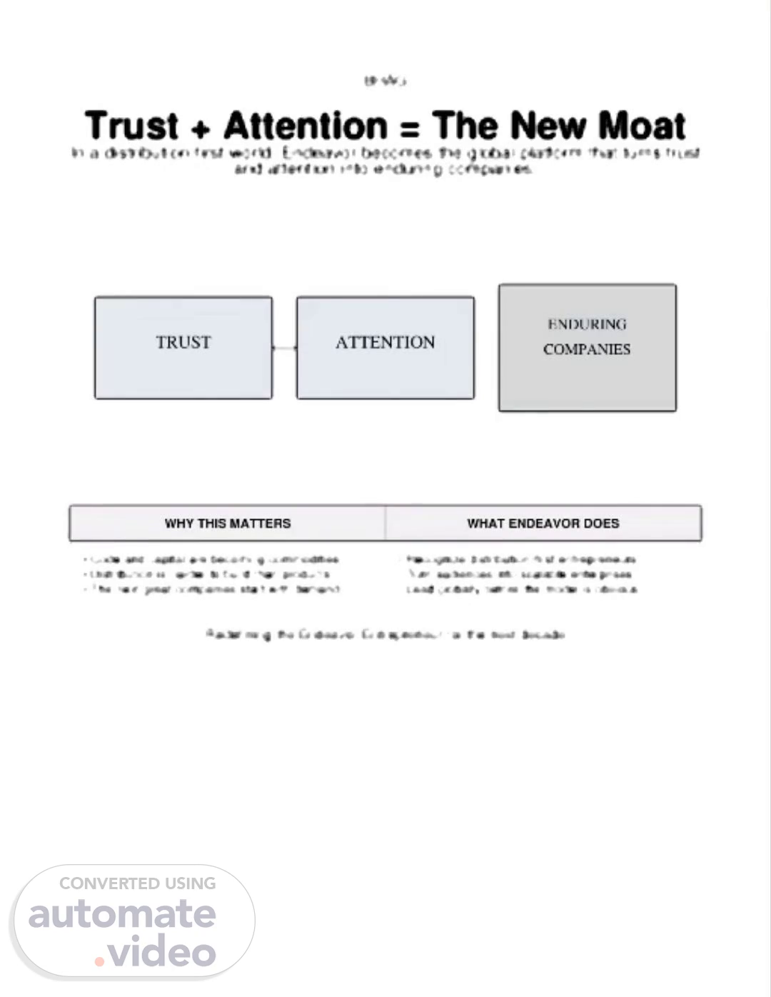 BHAG Trust + Attention = The New Moat In a distribution-first world, Endeavor becomes the global platform that turns trust and attention into enduring companies. TRUST ATTENTION ENDURING COMPANIES WHY THIS MATTERS WHAT ENDEAVOR DOES • Code and capital are becoming commodities • Distribution is harder to build than products • The next great companies start with demand • Recognize distribution-first entrepreneurs • Turn audiences into scalable enterprises • Lead globally before the model is obvious Redefining the Endeavor Entrepreneur for the next decade.