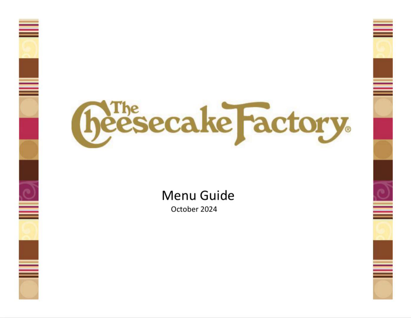 [Audio] Menu Guide Bartender-Cashier-Server-Food Runner CHEESECAKES You are responsible for knowing these cheesecakes 100%. Our cheesecake slices are presented with the tip pointing towards 7 o'clock on an imaginary clock, viewed from the guest's position. Dessert Presentation: Open the menu to both dessert pages, present a menu to each guest and follow your dessert presentation. Dessert offerings might vary due to market availability. "Here at the Cheesecake Factory, we're known for our fabulous desserts. Let me tell you about two of my favorites …" " Classic Basque Cheesecake" Our Creamy Original Cheesecake Loaded with Caramel Apples, Topped with More Caramel on a Graham Crust" "Restaurants Favorite Cheesecake" "All of our cheesecakes are served with our home-made whipped cream and go perfectly with a Cappuccino or Espresso?" 30th Anniversary Chocolate Cake Cheesecake Layers of our Original Cheesecake, Fudge Cake and Chocolate Truffle Cream Adam's Peanut Butter Cup Fudge Ripple Creamy Cheesecake Swirled with Caramel, Peanut Butter, Butterfinger® and Reese's Peanut Butter Cups® ID: Crushed Butterfingers® on top. Key Points: Four layers of yum! Two layers of our Original Cheesecake Two layers of our creamy chocolate fudge cake filled with chocolate cream and finished with crunchy pearls of chocolate. Caramel Pecan Turtle Cheesecake Fudge Brownie and Caramel-Fudge Swirl Cheesecake, Topped with Caramel Turtle Pecans and Chocolate Classic Basque Cheesecake Super Creamy Cheesecake with a Delicious and Uniquely "Burnt" Top, Covered with Fresh Berries Key Points: Not Gluten Free Key Points: Topped with caramel turtle pecans and chocolate ganache. Crustless Topped with Berry Mix © 2024 TCF Co. LLC. Confidential Information Do not duplicate or distribute outside of this company. Page 44.