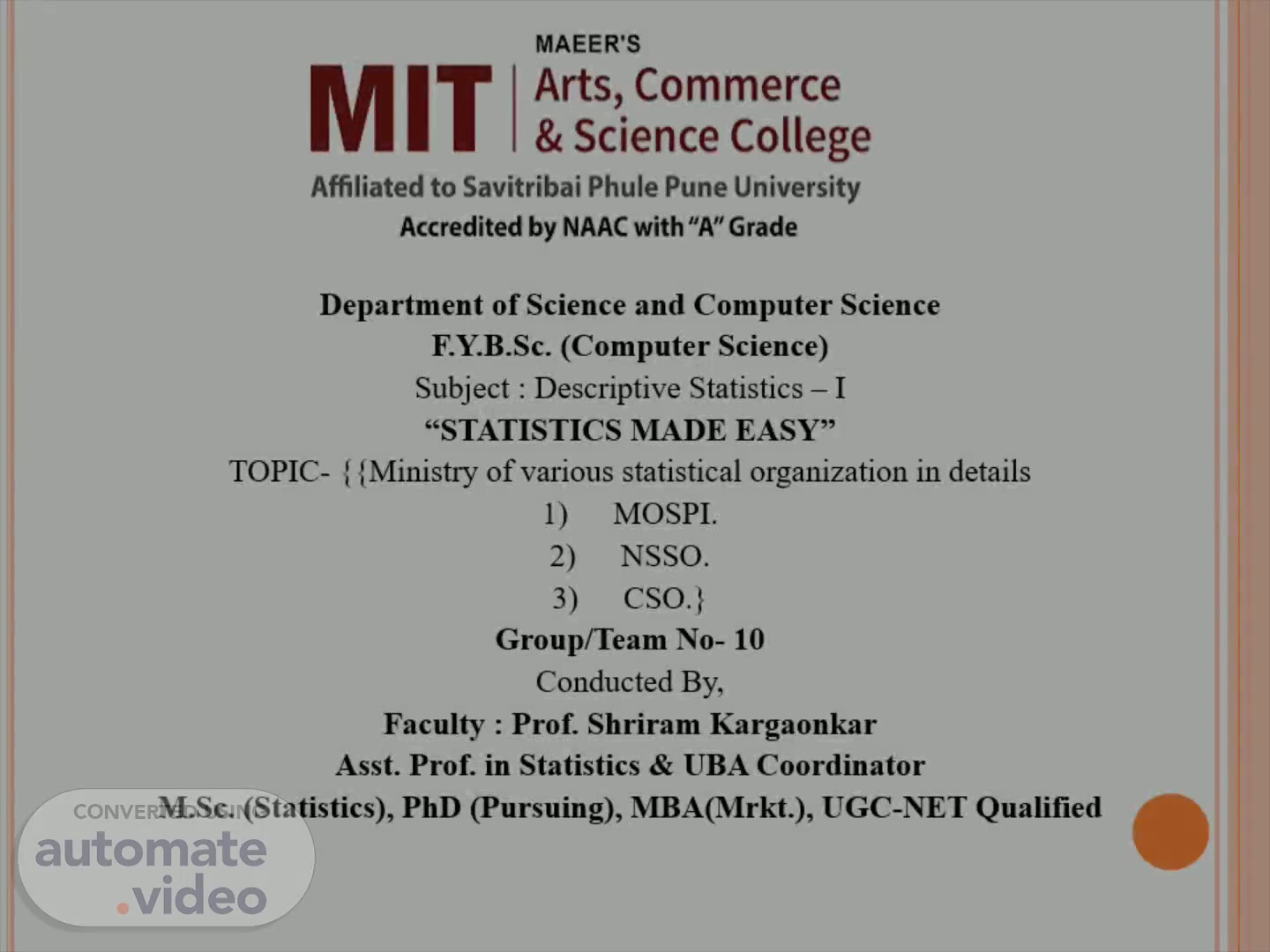 Department of Science and Computer Science F.Y.B.Sc . (Computer Science) Subject : Descriptive Statistics – I “STATISTICS MADE EASY” TOPIC- Group/Team No- 10 Conducted By, Faculty : Prof. Shriram Kargaonkar Asst. Prof. in Statistics & UBA Coordinator M.Sc. (Statistics), PhD (Pursuing), MBA( Mrkt .), UGC-NET Qualified.