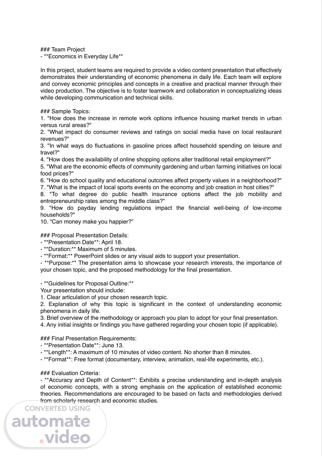 ### Team Project - **Economics in Everyday Life** In this project, student teams are required to provide a video content presentation that effectively demonstrates their understanding of economic phenomena in daily life. Each team will explore and convey economic principles and concepts in a creative and practical manner through their video production. The objective is to foster teamwork and collaboration in conceptualizing ideas while developing communication and technical skills. ### Sample Topics: 1. "How does the increase in remote work options influence housing market trends in urban versus rural areas?" 2. "What impact do consumer reviews and ratings on social media have on local restaurant revenues?" 3. "In what ways do fluctuations in gasoline prices affect household spending on leisure and travel?" 4. "How does the availability of online shopping options alter traditional retail employment?" 5. "What are the economic effects of community gardening and urban farming initiatives on local food prices?" 6. "How do school quality and educational outcomes affect property values in a neighborhood?" 7. "What is the impact of local sports events on the economy and job creation in host cities?" 8. "To what degree do public health insurance options affect the job mobility and entrepreneurship rates among the middle class?" 9. "How do payday lending regulations impact the financial well-being of low-income households?" 10. “Can money make you happier?” ### Proposal Presentation Details: - **Presentation Date**: April 18. - **Duration:** Maximum of 5 minutes. - **Format:** PowerPoint slides or any visual aids to support your presentation. - **Purpose:** The presentation aims to showcase your research interests, the importance of your chosen topic, and the proposed methodology for the final presentation. - **Guidelines for Proposal Outline:** Your presentation should include: 1. Clear articulation of your chosen research topic. 2. Explanation of why this topic is significant in the context of understanding economic phenomena in daily life. 3. Brief overview of the methodology or approach you plan to adopt for your final presentation. 4. Any initial insights or findings you have gathered regarding your chosen topic (if applicable). ### Final Presentation Requirements: - **Presentation Date**: June 13. - **Length**: A maximum of 10 minutes of video content. No shorter than 8 minutes. - **Format**: Free format (documentary, interview, animation, real-life experiments, etc.). ### Evaluation Criteria: - **Accuracy and Depth of Content**: Exhibits a precise understanding and in-depth analysis of economic concepts, with a strong emphasis on the application of established economic theories. Recommendations are encouraged to be based on facts and methodologies derived from scholarly research and economic studies..