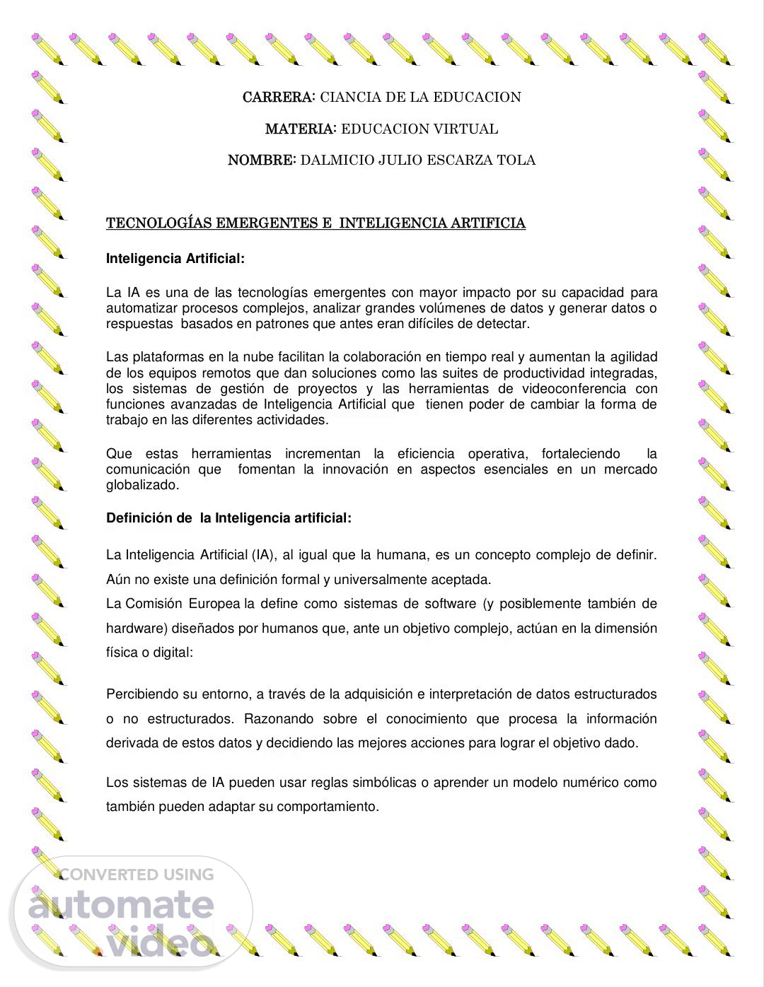 CARRERA: CIANCIA DE LA EDUCACION MATERIA: EDUCACION VIRTUAL NOMBRE: DALMICIO JULIO ESCARZA TOLA TECNOLOGÍAS EMERGENTES E INTELIGENCIA ARTIFICIA Inteligencia Artificial: La IA es una de las tecnologías emergentes con mayor impacto por su capacidad para automatizar procesos complejos, analizar grandes volúmenes de datos y generar datos o respuestas basados en patrones que antes eran difíciles de detectar. Las plataformas en la nube facilitan la colaboración en tiempo real y aumentan la agilidad de los equipos remotos que dan soluciones como las suites de productividad integradas, los sistemas de gestión de proyectos y las herramientas de videoconferencia con funciones avanzadas de Inteligencia Artificial que tienen poder de cambiar la forma de trabajo en las diferentes actividades. Que estas herramientas incrementan la eficiencia operativa, fortaleciendo la comunicación que fomentan la innovación en aspectos esenciales en un mercado globalizado. Definición de la Inteligencia artificial: La Inteligencia Artificial (IA), al igual que la humana, es un concepto complejo de definir. Aún no existe una definición formal y universalmente aceptada. La Comisión Europea la define como sistemas de software (y posiblemente también de hardware) diseñados por humanos que, ante un objetivo complejo, actúan en la dimensión física o digital: Percibiendo su entorno, a través de la adquisición e interpretación de datos estructurados o no estructurados. Razonando sobre el conocimiento que procesa la información derivada de estos datos y decidiendo las mejores acciones para lograr el objetivo dado. Los sistemas de IA pueden usar reglas simbólicas o aprender un modelo numérico como también pueden adaptar su comportamiento..