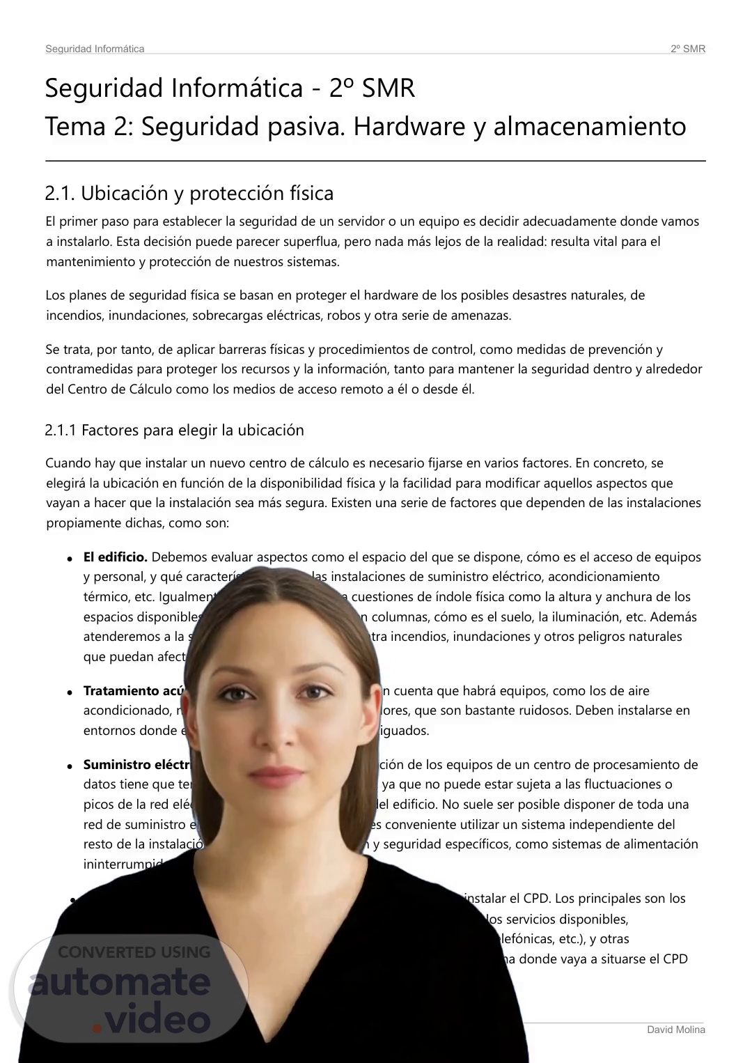 [Audio] La seguridad informática implica la protección de la información y los sistemas de computadora contra amenazas externas y internas. Para ello debemos considerar la ubicación y la protección física del hardware y el almacenamiento de datos. Esto incluye la elección de un edificio adecuado, el suministro eléctrico y el tratamiento acústico. En cuanto al hardware, debemos considerar la protección contra subidas y picos de tensión, lo que puede ser logrado mediante la instalación de un SAI (Supervisor de Ajuste de Tensión). El SAI permite controlar la tensión de manera eficiente y segura, evitando daños a los componentes electrónicos. Además, el SAI también ayuda a reducir el ruido de tensión y a mejorar la estabilidad de la tensión, lo que contribuye a una mayor durabilidad de los componentes. Por otro lado, el almacenamiento de la información es otro factor clave en la seguridad informática. Debemos considerar la rendimiento, la disponibilidad y la accesibilidad a la información. Para lograr esto, podemos utilizar técnicas como los sistemas RAID, los clusters de servidores y las arquitecturas SAN y NAS. Estas técnicas permiten combinar varios discos y distribuir la información entre ellos, lo que mejora la capacidad, la tolerancia a fallos y la seguridad. En resumen, la seguridad informática requiere una consideración integral de la ubicación, el hardware y el almacenamiento de la información para garantizar la protección de la información y los sistemas de computadora..