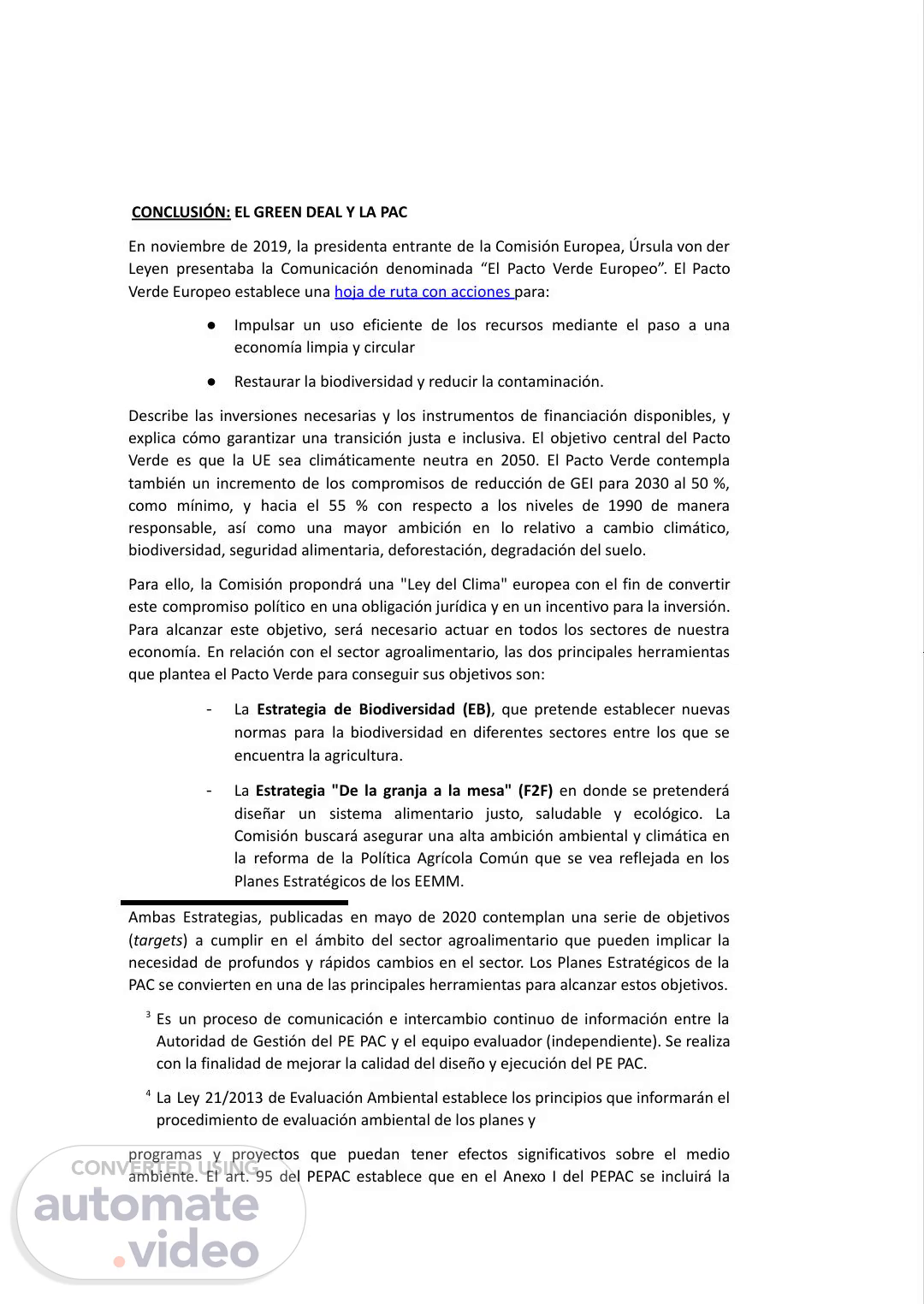 CONCLUSIÓN: EL GREEN DEAL Y LA PAC En noviembre de 2019, la presidenta entrante de la Comisión Europea, Úrsula von der Leyen presentaba la Comunicación denominada “El Pacto Verde Europeo”. El Pacto Verde Europeo establece una hoja de ruta con acciones para: ● Impulsar un uso eficiente de los recursos mediante el paso a una economía limpia y circular ● Restaurar la biodiversidad y reducir la contaminación. Describe las inversiones necesarias y los instrumentos de financiación disponibles, y explica cómo garantizar una transición justa e inclusiva. El objetivo central del Pacto Verde es que la UE sea climáticamente neutra en 2050. El Pacto Verde contempla también un incremento de los compromisos de reducción de GEI para 2030 al 50 %, como mínimo, y hacia el 55 % con respecto a los niveles de 1990 de manera responsable, así como una mayor ambición en lo relativo a cambio climático, biodiversidad, seguridad alimentaria, deforestación, degradación del suelo. Para ello, la Comisión propondrá una "Ley del Clima" europea con el fin de convertir este compromiso político en una obligación jurídica y en un incentivo para la inversión. Para alcanzar este objetivo, será necesario actuar en todos los sectores de nuestra economía. En relación con el sector agroalimentario, las dos principales herramientas que plantea el Pacto Verde para conseguir sus objetivos son: - La Estrategia de Biodiversidad (EB), que pretende establecer nuevas normas para la biodiversidad en diferentes sectores entre los que se encuentra la agricultura. - La Estrategia "De la granja a la mesa" (F2F) en donde se pretenderá diseñar un sistema alimentario justo, saludable y ecológico. La Comisión buscará asegurar una alta ambición ambiental y climática en la reforma de la Política Agrícola Común que se vea reflejada en los Planes Estratégicos de los EEMM. Ambas Estrategias, publicadas en mayo de 2020 contemplan una serie de objetivos (targets) a cumplir en el ámbito del sector agroalimentario que pueden implicar la necesidad de profundos y rápidos cambios en el sector. Los Planes Estratégicos de la PAC se convierten en una de las principales herramientas para alcanzar estos objetivos. 3 Es un proceso de comunicación e intercambio continuo de información entre la Autoridad de Gestión del PE PAC y el equipo evaluador (independiente). Se realiza con la finalidad de mejorar la calidad del diseño y ejecución del PE PAC. 4 La Ley 21/2013 de Evaluación Ambiental establece los principios que informarán el procedimiento de evaluación ambiental de los planes y programas y proyectos que puedan tener efectos significativos sobre el medio ambiente. El art. 95 del PEPAC establece que en el Anexo I del PEPAC se incluirá la.