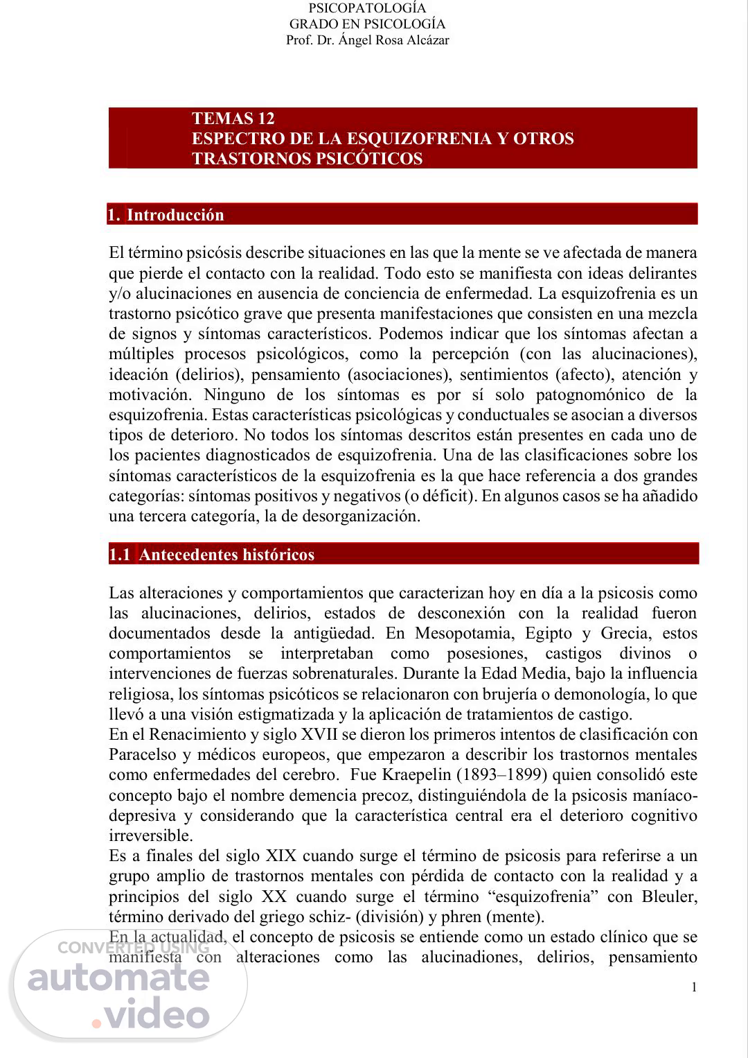 PSICOPATOLOGÍA GRADO EN PSICOLOGÍA Prof. Dr. Ángel Rosa Alcázar 1 TEMAS 12 ESPECTRO DE LA ESQUIZOFRENIA Y OTROS TRASTORNOS PSICÓTICOS 1. Introducción El término psicósis describe situaciones en las que la mente se ve afectada de manera que pierde el contacto con la realidad. Todo esto se manifiesta con ideas delirantes y/o alucinaciones en ausencia de conciencia de enfermedad. La esquizofrenia es un trastorno psicótico grave que presenta manifestaciones que consisten en una mezcla de signos y síntomas característicos. Podemos indicar que los síntomas afectan a múltiples procesos psicológicos, como la percepción (con las alucinaciones), ideación (delirios), pensamiento (asociaciones), sentimientos (afecto), atención y motivación. Ninguno de los síntomas es por sí solo patognomónico de la esquizofrenia. Estas características psicológicas y conductuales se asocian a diversos tipos de deterioro. No todos los síntomas descritos están presentes en cada uno de los pacientes diagnosticados de esquizofrenia. Una de las clasificaciones sobre los síntomas característicos de la esquizofrenia es la que hace referencia a dos grandes categorías: síntomas positivos y negativos (o déficit). En algunos casos se ha añadido una tercera categoría, la de desorganización. 1.1 Antecedentes históricos Las alteraciones y comportamientos que caracterizan hoy en día a la psicosis como las alucinaciones, delirios, estados de desconexión con la realidad fueron documentados desde la antigüedad. En Mesopotamia, Egipto y Grecia, estos comportamientos se interpretaban como posesiones, castigos divinos o intervenciones de fuerzas sobrenaturales. Durante la Edad Media, bajo la influencia religiosa, los síntomas psicóticos se relacionaron con brujería o demonología, lo que llevó a una visión estigmatizada y la aplicación de tratamientos de castigo. En el Renacimiento y siglo XVII se dieron los primeros intentos de clasificación con Paracelso y médicos europeos, que empezaron a describir los trastornos mentales como enfermedades del cerebro. Fue Kraepelin (1893–1899) quien consolidó este concepto bajo el nombre demencia precoz, distinguiéndola de la psicosis maníaco- depresiva y considerando que la característica central era el deterioro cognitivo irreversible. Es a finales del siglo XIX cuando surge el término de psicosis para referirse a un grupo amplio de trastornos mentales con pérdida de contacto con la realidad y a principios del siglo XX cuando surge el término “esquizofrenia” con Bleuler, término derivado del griego schiz- (división) y phren (mente). En la actualidad, el concepto de psicosis se entiende como un estado clínico que se manifiesta con alteraciones como las alucinadiones, delirios, pensamiento.