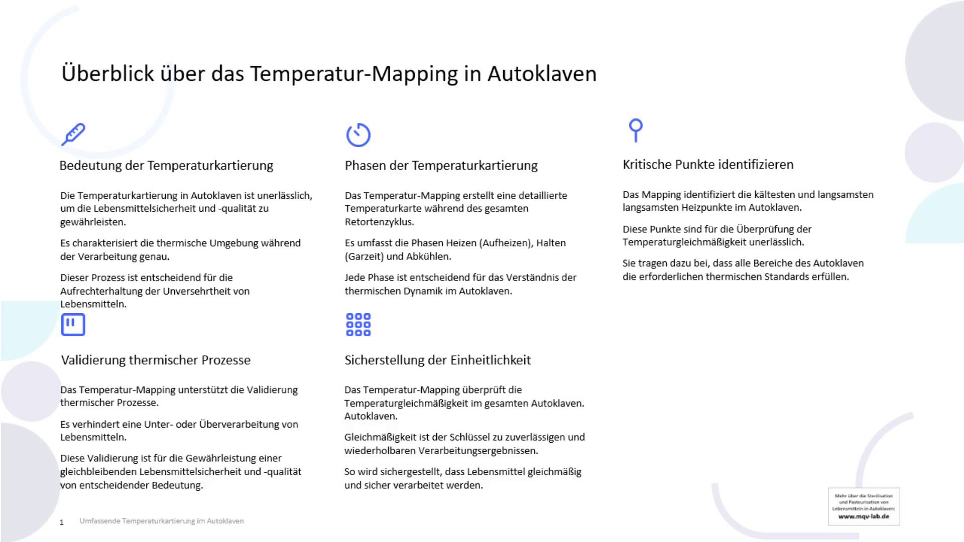 [Audio] Zusammenfassend lässt sich sagen, dass eine strategische Sensorplatzierung für die genaue Erfassung thermischer Schwankungen innerhalb des Autoklaven unerlässlich ist. Die richtige Positionierung der Sensoren gewährleistet eine umfassende Temperaturkarte und hilft bei der Identifizierung potenzieller Hotspots, was der Schlüssel zu zuverlässigen und wiederholbaren Daten ist. Um die Zuverlässigkeit der Daten zu gewährleisten, müssen mehrere Durchläufe durchgeführt werden, um die Konsistenz der Ergebnisse der Temperaturkartierung zu validieren. Die Wiederholung des Prozesses bestätigt die Zuverlässigkeit der gesammelten Daten und minimiert Fehler, wodurch das Vertrauen in die Ergebnisse erhöht wird. Ein sorgfältiges Management von Druck und Last ist wichtig, um Schäden an verpackten Materialien zu vermeiden. Durch die Optimierung von Druckprofilen und Beladungskonfigurationen wird eine gleichmäßige Erwärmung erreicht, die dazu beiträgt, die Sicherheit und Qualität der verarbeiteten Produkte zu erhalten. Die umfassende Datenanalyse umfasst sowohl die statistische Auswertung als auch die visuelle Inspektion von Temperaturprofilen. Diese gründliche Überprüfung hilft bei der Erkennung von Anomalien und stellt die Genauigkeit des Mapping-Prozesses sicher, was für die Optimierung der Autoklavenleistung entscheidend ist. Schließlich werden durch eine gründliche Berichterstattung alle Ergebnisse konsolidiert, um die Effizienz des Autoklaven zu verbessern. Eine detaillierte Dokumentation garantiert die Sicherheit und Qualität der Produkte und dient als wertvolle Referenz für zukünftige Verbesserungen und Audits..