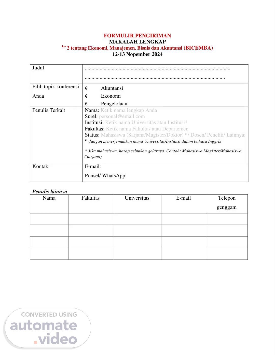 FORMULIR PENGIRIMAN MAKALAH LENGKAP ke- 2 tentang Ekonomi, Manajemen, Bisnis dan Akuntansi (BICEMBA) 12-13 Nopember 2024 Judul ............................................................................................................ ........................................................................................................ Pilih topik konferensi Anda € Akuntansi € Ekonomi € Pengelolaan Penulis Terkait Nama: Ketik nama lengkap Anda Surel: [email protected] Institusi: Ketik nama Universitas atau Institusi* Fakultas: Ketik nama Fakultas atau Departemen Status: Mahasiswa (Sarjana/Magister/Doktor) */ Dosen/ Peneliti/ Lainnya: * Jangan menerjemahkan nama Universitas/Institusi dalam bahasa Inggris * Jika mahasiswa, harap sebutkan gelarnya. Contoh: Mahasiswa Magister/Mahasiswa (Sarjana) Kontak E-mail: Ponsel/ WhatsApp: Penulis lainnya Nama Fakultas Universitas E-mail Telepon genggam.