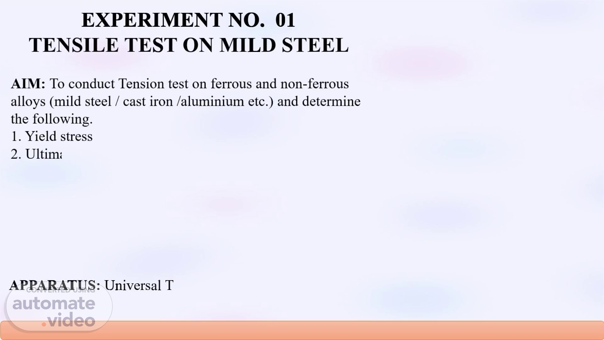 [Audio] EXPERIMENT NO. – 01 TENSILE TEST ON MILD STEEL Aim: To conduct Tension test on ferrous and non-ferrous alloys (mild steel / cast iron /aluminium etc.) and determine the following. 1. Yield stress 2. Ultimate stress 3. Breaking stress 4. Percentage elongation 5. Percentage reduction in area Reference: IS 1608 Method for tensile testing of steel products. Apparatus: Universal testing machine, test specimen, steel rule, vernier calipers..