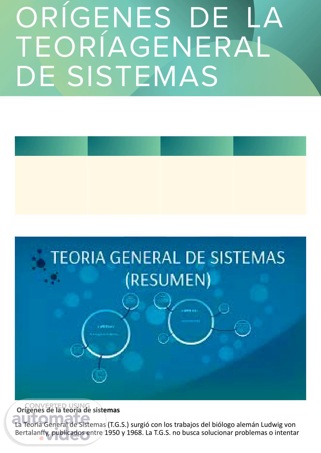 [Audio] ORÍGENES DE LA TEORÍAGENERAL DE SISTEMAS Orígenes de la teoría de sistemas La Teoría General de Sistemas (T.G.S.) surgió con los trabajos del biólogo alemán Ludwig von Bertalanffy, publicados entre 1950 y 1968. La T.G.S. no busca solucionar problemas o intentar.