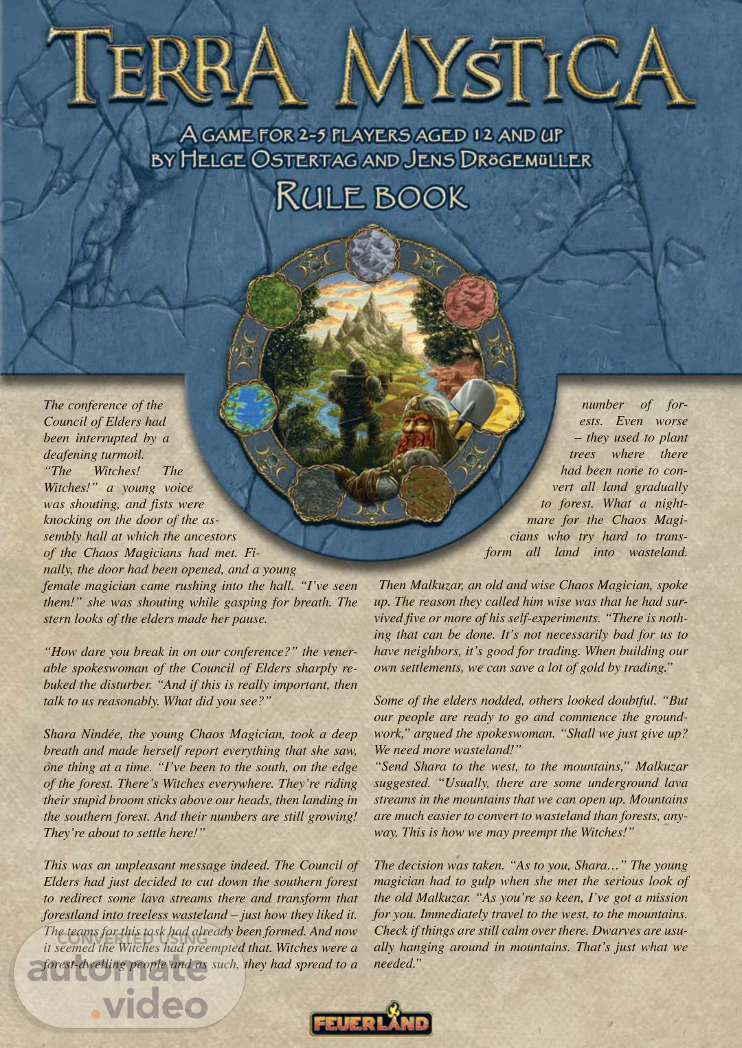 [Audio] INTRODUCTION In Terra Mystica each player governs one of 14 factions trying to develop more successfully than their opponents. Terra Mystica is a magical world: its inhabitants are able to transform the terrain they are living in. Each faction is bound to a specific type of terrain: It can only build structures on its "Home terrain". This is why each faction over the centuries needed to develop Terraforming capability. A faction either lives in the Plains, the Swamp, the Lakes, the Forest, the Forest, the Forest Mountains, the Wasteland, or the Wasteland, or the Wasteland Desert – Desert – Desert and each of them strives to transform the terrain according to its needs. In the game, the players need to expand to build Dwellings. However, as they gain Power when another player builds Dwellings or upgrades Structures directly adjacent to them, each player has to face the challenge of finding the right balance between adjacency to other players and free space for expansion. Existing Dwellings can be upgraded in multiple steps: to a Trading house at first, then to a Stronghold or Temple. One Temple can be upgraded to a Sanctuary. Dwellings provide Workers. Upgrading a Structure increases your income in Coins, Power, or Priests. A Dwelling may become a Sanctuary in three steps. Alternatively, one Trading house may become a Stronghold. Besides geographic expansion and upgrading Structures, players can also develop four Cults: Earth, Water, Fire, and Air. Progress in these will be displayed on the Cult board. Developing them also provides an increase in Power and other rewards. The Cult board Cult of Fire Town key (indicates that you need to found a Town first to advance to the last space of a Cult track) Cult of Water Power gained when advancing on the Cult track Cult of Earth Cult of Air Order of the Cult of Air (enables you to advance multiple steps on the track at once) In the end, the player who developed their faction the best wins the game. 2.