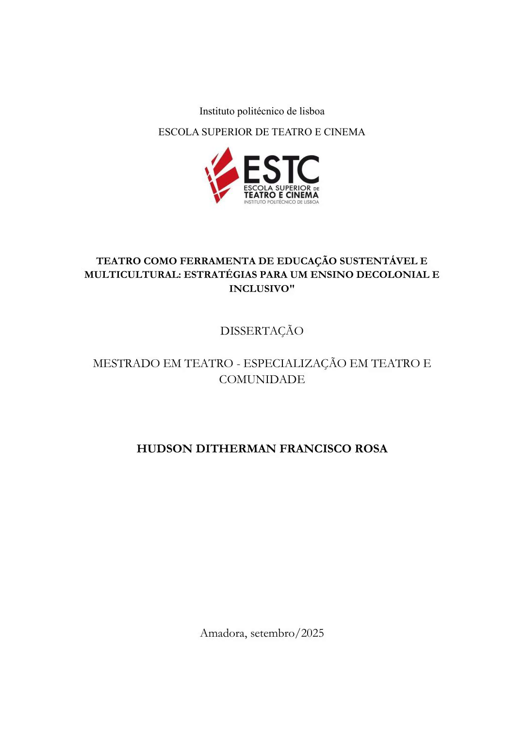 [Audio] Instituto politécnico de lisboa ESCOLA SUPERIOR DE TEATRO E CINEMA TEATRO COMO FERRAMENTA DE EDUCAÇÃO SUSTENTÁVEL E MULTICULTURAL: ESTRATÉGIAS PARA UM ENSINO DECOLONIAL E INCLUSIVO" HUDSON DITHERMAN FRANCISCO ROSA Dissertação apresentada à Escola Superior de Teatro e Cinema para cumprimento dos requisitos necessários à obtenção do grau de Mestre em Teatro – especialização em Teatro e Comunidade, realizado sob a orientação do Prof. Doutor Armando Nascimento Rosa, professor coordenador da área de Teorias e Estéticas, e sob a coorientação da Prof.ª Especialista Rita Wengorovius, professora adjunta convidada Amadora, setembro/2025.