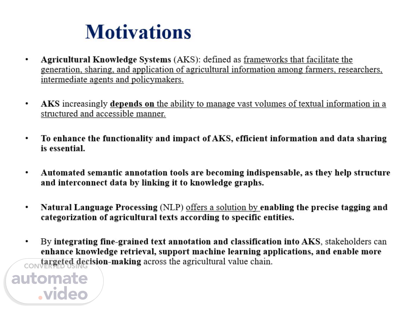 [Audio] Motivations Agricultural Knowledge Systems (AKS): defined as frameworks that facilitate the generation, sharing, and application of agricultural information among farmers, researchers, intermediate agents and policymakers. AKS increasingly depends on the ability to manage vast volumes of textual information in a structured and accessible manner. To enhance the functionality and impact of AKS, efficient information and data sharing is essential. Automated semantic annotation tools are becoming indispensable, as they help structure and interconnect data by linking it to knowledge graphs. Natural Language Processing (NLP) offers a solution by enabling the precise tagging and categorization of agricultural texts according to specific entities. By integrating fine-grained text annotation and classification into AKS, stakeholders can enhance knowledge retrieval, support machine learning applications, and enable more targeted decision-making across the agricultural value chain. الدوافع أنظمة المعرفة الزراعية (AKS): تُعرّف بأنها أطر عمل تُسهّل توليد المعلومات الزراعية وتبادلها وتطبيقها بين المزارعين والباحثين والوسطاء وصانعي السياسات. تعتمد أنظمة المعرفة الزراعية (AKS) بشكل متزايد على القدرة على إدارة كميات هائلة من المعلومات النصية بطريقة منظمة وسهلة الوصول. لتحسين وظائف وتأثير أنظمة المعرفة الزراعية (AKS)، يُعدّ تبادل المعلومات والبيانات بكفاءة أمرًا أساسيًا. أصبحت أدوات التعليق الدلالي الآلي لا غنى عنها، إذ تُساعد على هيكلة البيانات وربطها ببعضها من خلال ربطها برسوم بيانية معرفية. تُقدّم معالجة اللغة الطبيعية (NLP) حلاً من خلال تمكين وضع العلامات وتصنيف النصوص الزراعية بدقة وفقًا لجهات مُحددة. من خلال دمج التعليقات والتصنيفات النصية الدقيقة في أنظمة المعرفة الزراعية (AKS)، يُمكن لأصحاب المصلحة تحسين استرجاع المعرفة، ودعم تطبيقات التعلم الآلي، وتمكين اتخاذ قرارات أكثر استهدافًا عبر سلسلة القيمة الزراعية..