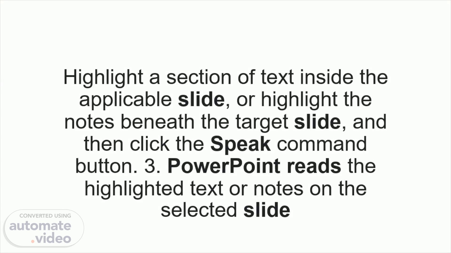 Highlight a section of text inside the applicable slide, or highlight the notes beneath the target slide, and then click the Speak command button. 3. PowerPoint reads the highlighted text or notes on the selected slide