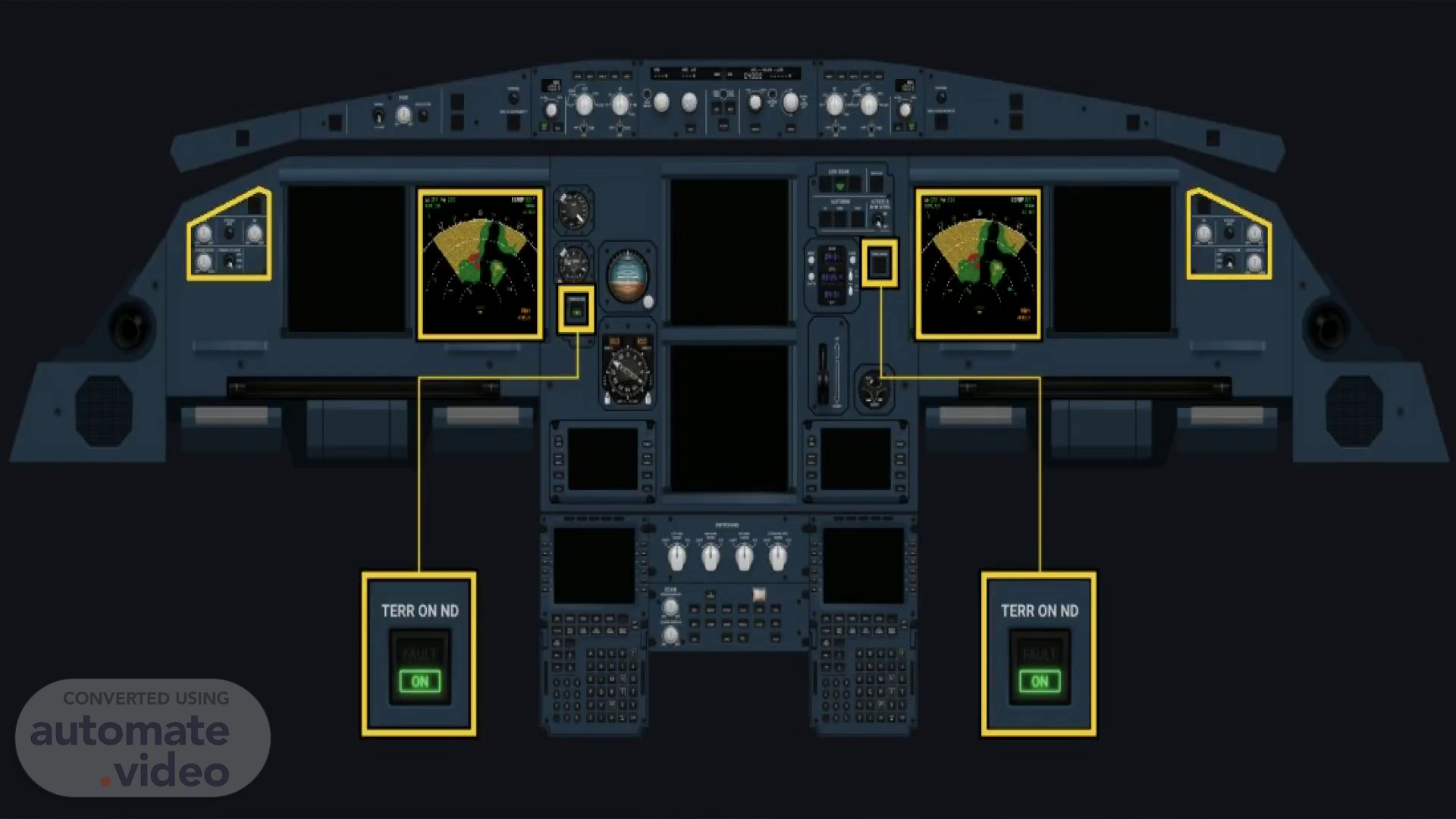 [Audio] GPWS visual warnings are provided on the MISCELLANEOUS panels. From here the maintenance crew can test the system. EGPWS terrain display. A forward-looking capability for terrain, its purpose is to display terrain elevation surrounding the aircraft in color coded to avoid controlled flight into terrain and give enough time to the crew to perform an avoidance maneuver. Terrain information is displayed on ND by selecting either one of the TERR on ND pushbutton switch which are fitted on each side of the main panel..