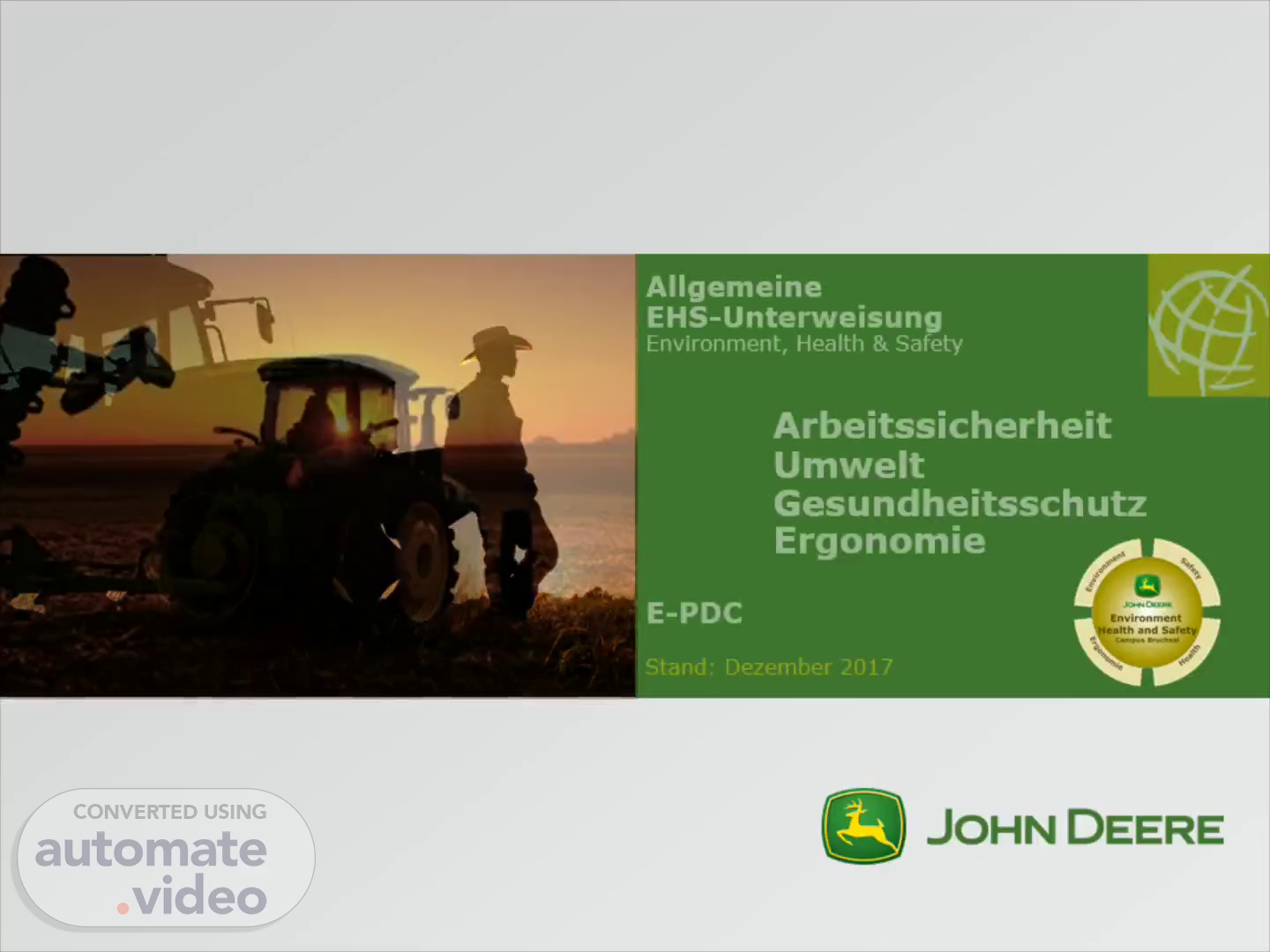 [Audio] „Für das Wohlbefinden unserer Mitarbeiter schaffen kontinuierliche Verbesserungsprogramme und Projekte verletzungsfreie, gesunde Arbeitsplätze." „Bei John Deere wird hart und mit einem Ziel gearbeitet. Dieses Ziel besteht darin, so sicher wie möglich zu arbeiten. Wir vermeiden unnötige Risiken für uns, für andere und für das Unternehmen." „Bei der Investition in neue Produkte, Konzepte oder Technologien bevorzugen wir diejenigen mit den geringsten negativen Auswirkungen auf die Umwelt.".