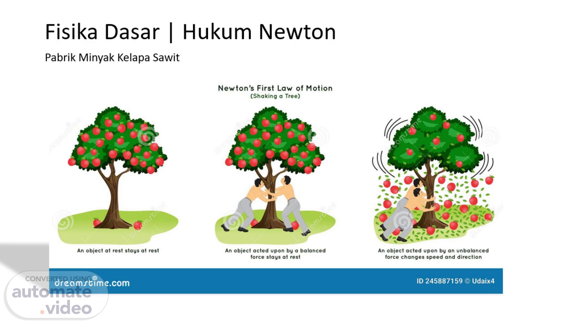 [Audio] Selamat pagi, teman-teman. Pada kesempatan ini, saya akan membagikan materi tentang hukum newton. Apa itu hukum newton? Hukum newton adalah hukum gerak yang menjadi hukum dasar dinamika dengan merumuskan gaya terhadap pengaruh gerak pada benda tertentu. Hukum newton dibagi menjadi tiga, yaitu hukum newton 1, hukum newton 2, dan hukum newton 3. Hukum newton ini ditemukan oleh ilmuwan fisika terkenal bernama Sir Isaac Newton, yang juga dikenang sebagai nama satuan gaya (N/Newton). Hukum newton sangat berkaitan dengan kehidupan sehari-hari kita di pabrik kelapa sawit. Nah, bagaimana cara memahami hukum newton ini? Mari kita simak penjelasan, rumus, dan contoh soalnya bersama-sama..