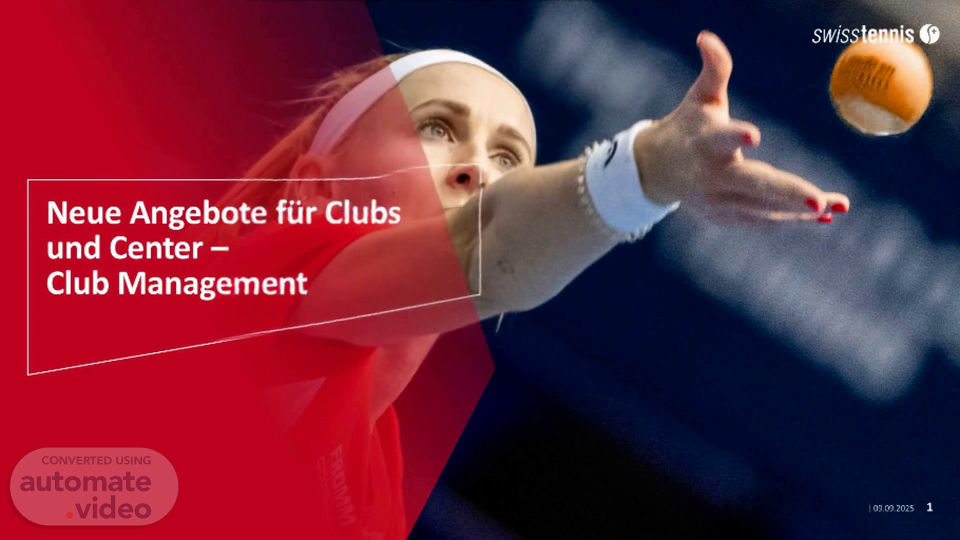 [Audio] Unser Club Management Team heißt Sie herzlich willkommen zu unserer Präsentation über die neuen Angebote für Clubs und Center. Wir möchten Ihnen Informationen zu unserem neuen Programm vorstellen, das ab dem 09.09.2025 verfügbar sein wird. Unser Angebot umfasst alle wichtigen Informationen über Aus- und Fortbildungen, Wettkämpfe, Spitzensport, den Login-Bereich, myTennis, Kids Tennis, den Verband und Padel. Ein besonderes Highlight und neues Angebot ist unser Club Coaching Service. In Zusammenarbeit mit Swiss Tennis bieten unsere Club Coaches individuelle Beratungen für Clubs und Center an, um sie fit für die Zukunft zu machen. Ab 2026 werden erfahrene Club Coaches zusammen mit Ihnen praxisorientierte Lösungen erarbeiten, die auf Ihre individuelle Situation zugeschnitten sind. Unser Programm hat zum Ziel, Ihnen bei strategischen Fragen im Bereich des Club Managements zur Seite zu stehen. Dazu gehören die Weiterentwicklung der Infrastruktur, Aus- und Fortbildung sowie die Optimierung Ihres Trainingsbetriebs. Wir laden Sie herzlich ein, an dieser Aus- und Fortbildung teilzunehmen und gemeinsam mit uns Ihren Club oder Ihr Center erfolgreich in die Zukunft zu führen. Kontaktieren Sie uns gerne für weitere Informationen und bleiben Sie auf dem neuesten Stand über alle Entwicklungen. Wir hoffen, Ihnen einen Einblick in unsere neuen Angebote für Clubs und Center geben zu können. Haben Sie einen schönen Tag und bis bald!.