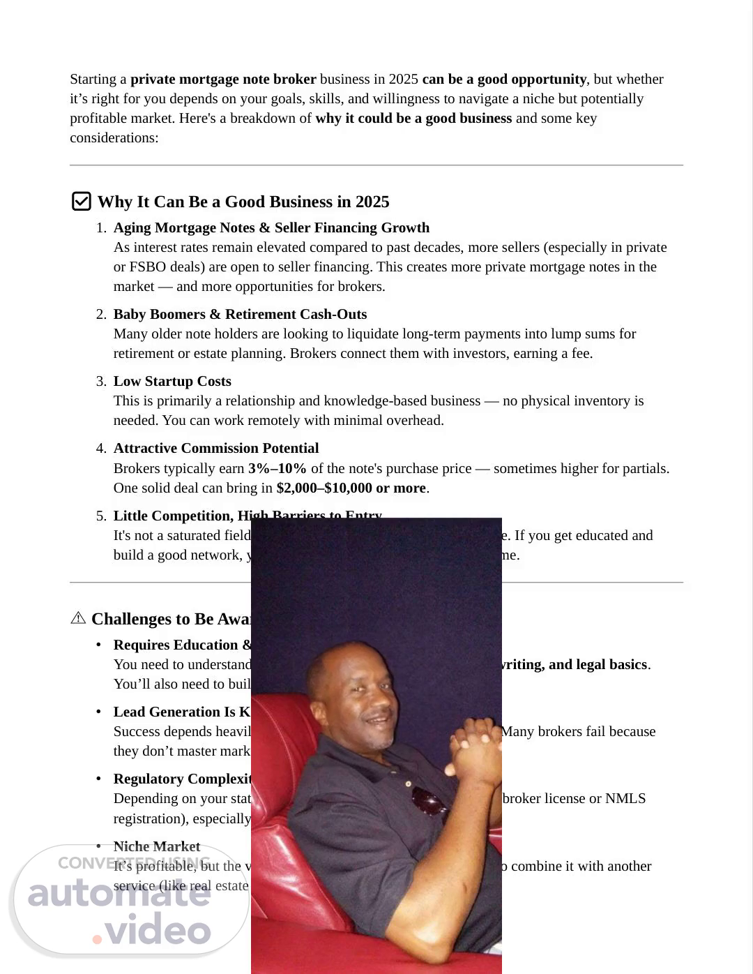 Starting a private mortgage note broker business in 2025 can be a good opportunity, but whether it’s right for you depends on your goals, skills, and willingness to navigate a niche but potentially profitable market. Here's a breakdown of why it could be a good business and some key considerations: ✅ Why It Can Be a Good Business in 2025 1. Aging Mortgage Notes & Seller Financing Growth As interest rates remain elevated compared to past decades, more sellers (especially in private or FSBO deals) are open to seller financing. This creates more private mortgage notes in the market — and more opportunities for brokers. 2. Baby Boomers & Retirement Cash-Outs Many older note holders are looking to liquidate long-term payments into lump sums for retirement or estate planning. Brokers connect them with investors, earning a fee. 3. Low Startup Costs This is primarily a relationship and knowledge-based business — no physical inventory is needed. You can work remotely with minimal overhead. 4. Attractive Commission Potential Brokers typically earn 3%–10% of the note's purchase price — sometimes higher for partials. One solid deal can bring in $2,000–$10,000 or more. 5. Little Competition, High Barriers to Entry It's not a saturated field like real estate wholesaling or e-commerce. If you get educated and build a good network, you can become a go-to expert in a short time. ⚠ Challenges to Be Aware Of • Requires Education & Trust Building You need to understand note valuation, risk assessment, underwriting, and legal basics. You’ll also need to build trust with both sellers and investors. • Lead Generation Is Key Success depends heavily on finding note holders willing to sell. Many brokers fail because they don’t master marketing, networking, or cold outreach. • Regulatory Complexity Depending on your state, you may need licenses (like a mortgage broker license or NMLS registration), especially if you're brokering notes regularly. • Niche Market It’s profitable, but the volume of deals isn’t huge. You may need to combine it with another service (like real estate investing or consulting) to scale..