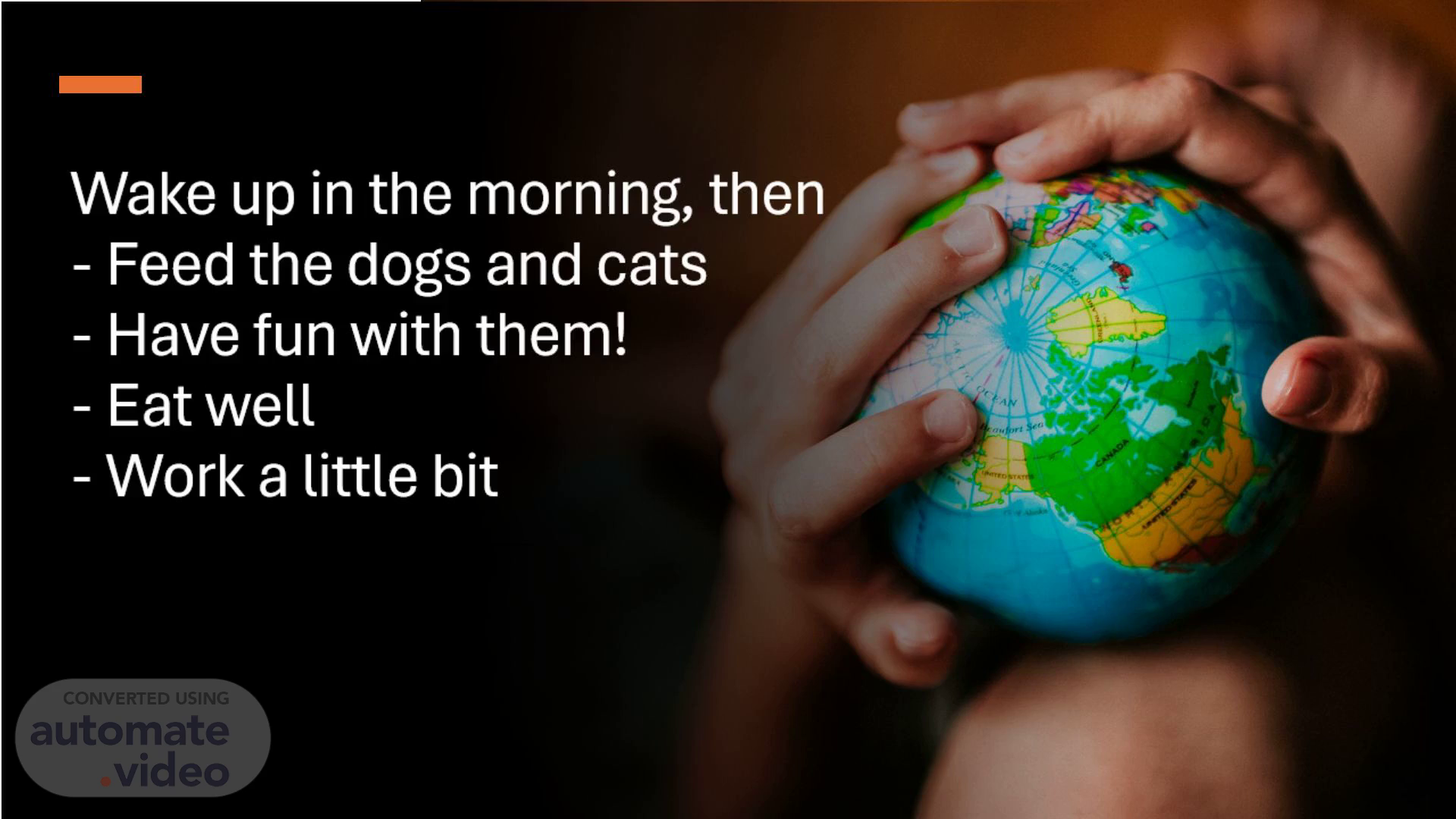 [Audio] When you wake up in the morning, keep in mind some key elements to guide your day. First, feed the dogs and cats Second, have lots of fun playing with them Third, remember to eat healthy stuff. Finally, work a little bit. But not too much..