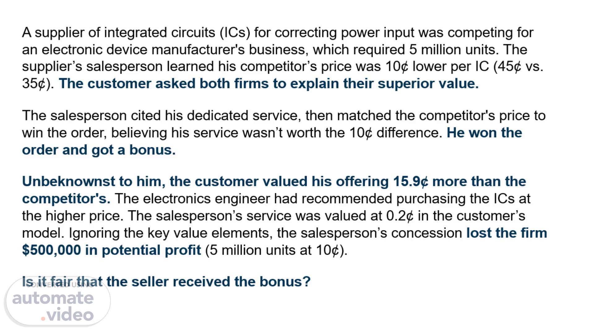[Audio] A supplier of integrated circuits (ICs) for correcting power input was competing for an electronic device manufacturer's business, which required 5 million units. The supplier’s salesperson learned his competitor’s price was 10¢ lower per IC (45¢ against 35¢). The customer asked both firms to explain their superior value. The salesperson cited his dedicated service, then matched the competitor's price to win the order, believing his service wasn’t worth the 10¢ difference. He won the order and got a bonus. Unbeknownst to him, the customer valued his offering 15.9¢ more than the competitor's. The electronics engineer had recommended purchasing the ICs at the higher price. The salesperson’s service was valued at 0.2¢ in the customer’s model. Ignoring the key value elements, the salesperson’s concession lost the firm $500000 in potential profit (5 million units at 10¢). Is it fair that the seller received the bonus? Although many supplier firm managers tout the value their market offerings provide customers, those managers have little to say when pressed for specifics on what their market offerings are worth to customers. One firm's stationery and business cards boast: "Delivering Superior Value with Alpha and Beta Brands."' Yet, when senior management was asked what actual assessments had been done to understand the value of their firm's offerings, they answered that the firm had not done any. Perhaps the firm was delivering superior value. What is more in doubt is whether the firm was receiving an equitable return, or if it was simply giving value away. Because a large percentage of the typical firm's revenues go to pay for goods and services it acquires from suppliers, firms increasingly focus on their purchasing practices to improve profitability. Widespread quality management in production and greater availability of comparable market offerings from international sources have led firms to pressure their suppliers to reduce prices and provide discounts. As a result, suppliers in many industries find that, although their sales revenues are growing, it is often at the expense of profitability. To persuade customer managers to focus on total costs rather than on acquisition price, suppliers must have an accurate understanding of what the customer firm values and would value..