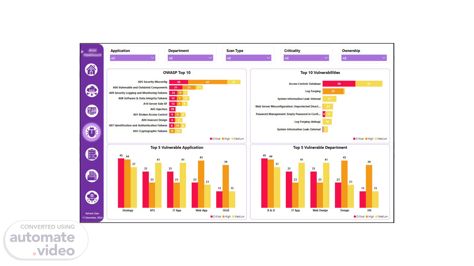 [Audio] OWASP Vulnerability:- The OWASP Top 10 highlights key risks, with Security Misconfigurations and Outdated Components topping the list. The Top 10 Vulnerabilities show access control issues as the most severe, emphasizing immediate attention. The data pinpoints the top 5 vulnerable applications, like Strategy and ATS, and departments like B&D and IT App requiring focused mitigation. AVM Dashboard insights helps us to stay ahead of threats by prioritizing critical risks and secures our systems..