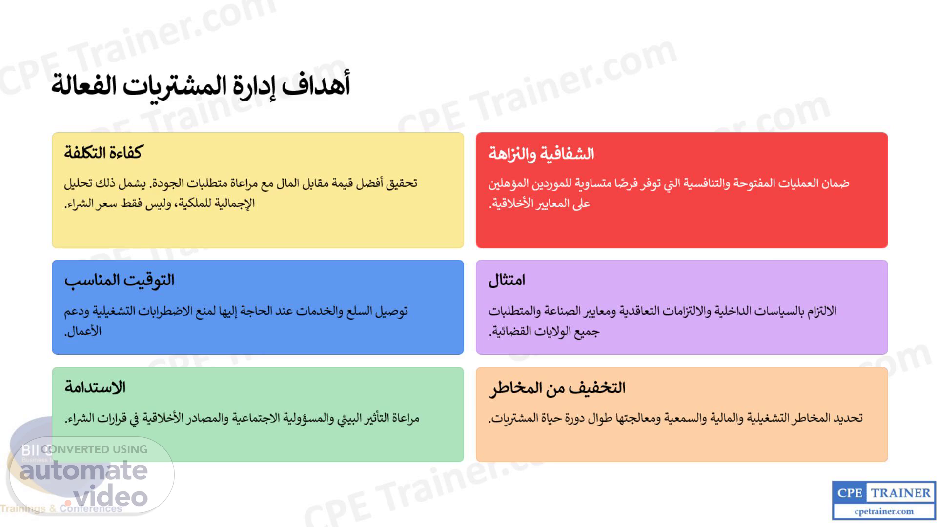[Audio] tts:Tammy_Grit <وقت الاستراحة="2ثانية"/> المشتريات تتجاوز مجرد شراء السلع والخدمات. فإدارة المشتريات الفعّالة تضمن للمؤسسات تعظيم قيمتها، وحماية نزاهة أعمالها، ودعم استدامة أعمالها على المدى الطويل. <وقت الاستراحة="2ثانية"/> الهدف الأول هو كفاءة التكلفة . وهذا لا يعني التركيز فقط على أقل سعر شراء، بل النظر أيضًا إلى التكلفة الإجمالية للملكية، والتي تشمل تكاليف الصيانة والتشغيل، وحتى التخلص من المنتج في نهاية دورة حياته. وبذلك، تحقق المؤسسات قيمة حقيقية مقابل المال. <وقت الاستراحة="2ثانية"/> ثانيًا، الشفافية والإنصاف . يجب أن تكون قرارات الشراء مفتوحة وتنافسية. يجب أن يحظى كل مورد مؤهل بفرصة عادلة، ويجب الالتزام بالمعايير الأخلاقية طوال العملية. هذا يبني الثقة، داخليًا ومع أصحاب المصلحة الخارجيين. <وقت الاستراحة="2ثانية"/>.