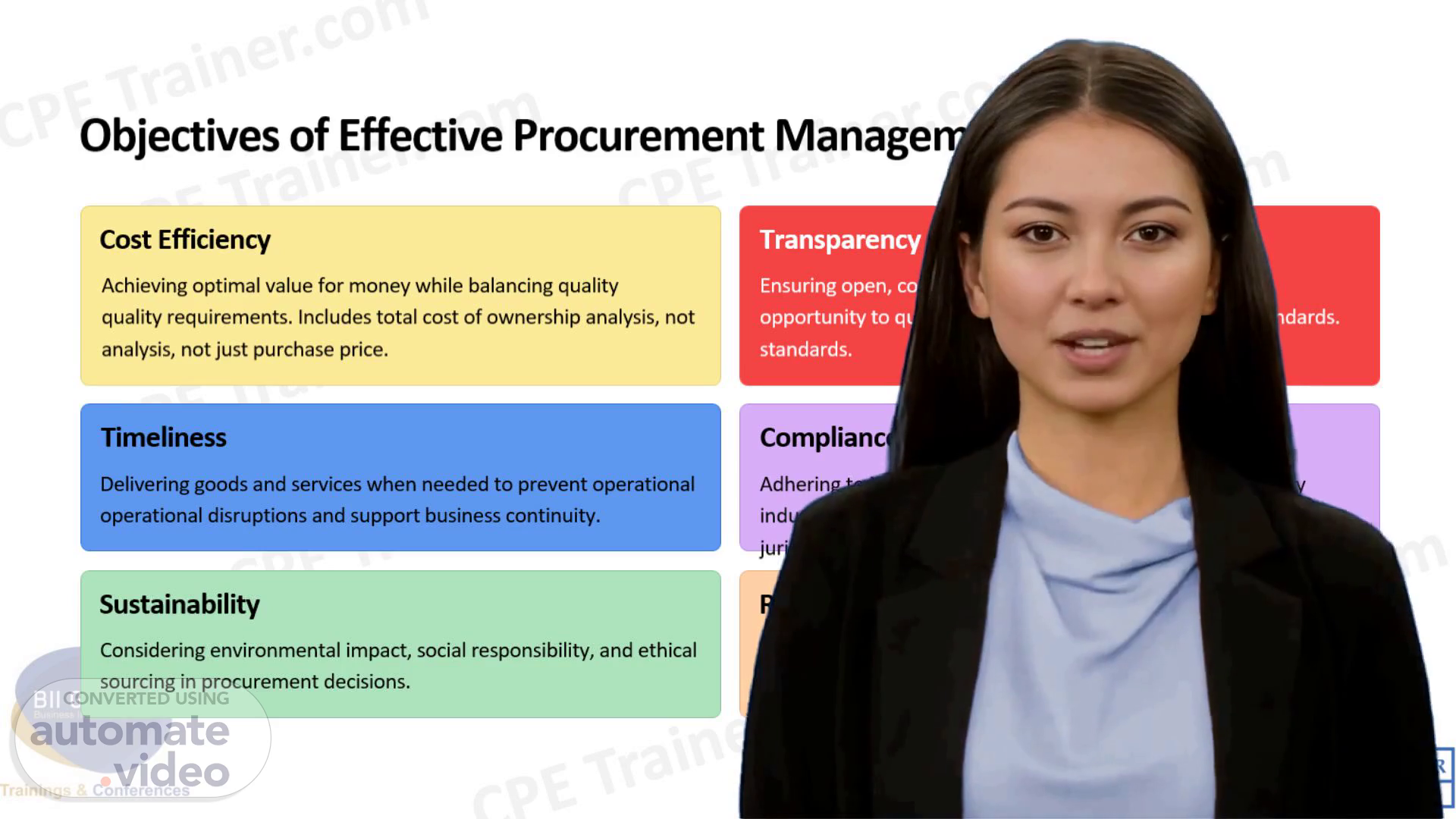 [Virtual Presenter] Procurement is much more than simply buying goods and services. Effective procurement management ensures that organizations maximize value, protect integrity, and support long-term sustainability. The first objective is cost efficiency. This means not just focusing on the lowest purchase price, but looking at the total cost of ownership. That includes maintenance, operating costs, and even disposal at the end of the lifecycle. By doing this, organizations achieve real value for money. Next, transparency and fairness. Procurement decisions must be open and competitive. Every qualified supplier should have a fair chance, and ethical standards must be maintained throughout the process. This builds trust, both internally and with external stakeholders. The third objective is timeliness. Even the best contract loses value if goods or services don’t arrive when needed. Timely procurement prevents disruptions and ensures business continuity, which is especially critical in fast-changing industries. Another key goal is compliance. Procurement activities must follow internal policies, legal requirements, industry regulations, and contractual obligations. Failure here can expose an organization to legal and reputational risks. We also need to consider sustainability. Today, procurement decisions should reflect environmental and social responsibility, from choosing eco-friendly products to working with ethical suppliers. Sustainable procurement strengthens an organization’s reputation and contributes to long-term success. Finally, risk mitigation. Procurement comes with operational, financial, and reputational risks. Identifying and managing these risks throughout the procurement lifecycle helps organizations stay resilient and prepared for uncertainty. In summary, effective procurement management balances cost, ethics, compliance, timeliness, sustainability, and risk management. By focusing on these objectives, organizations not only save money, but also strengthen resilience, reputation, and long-term performance..